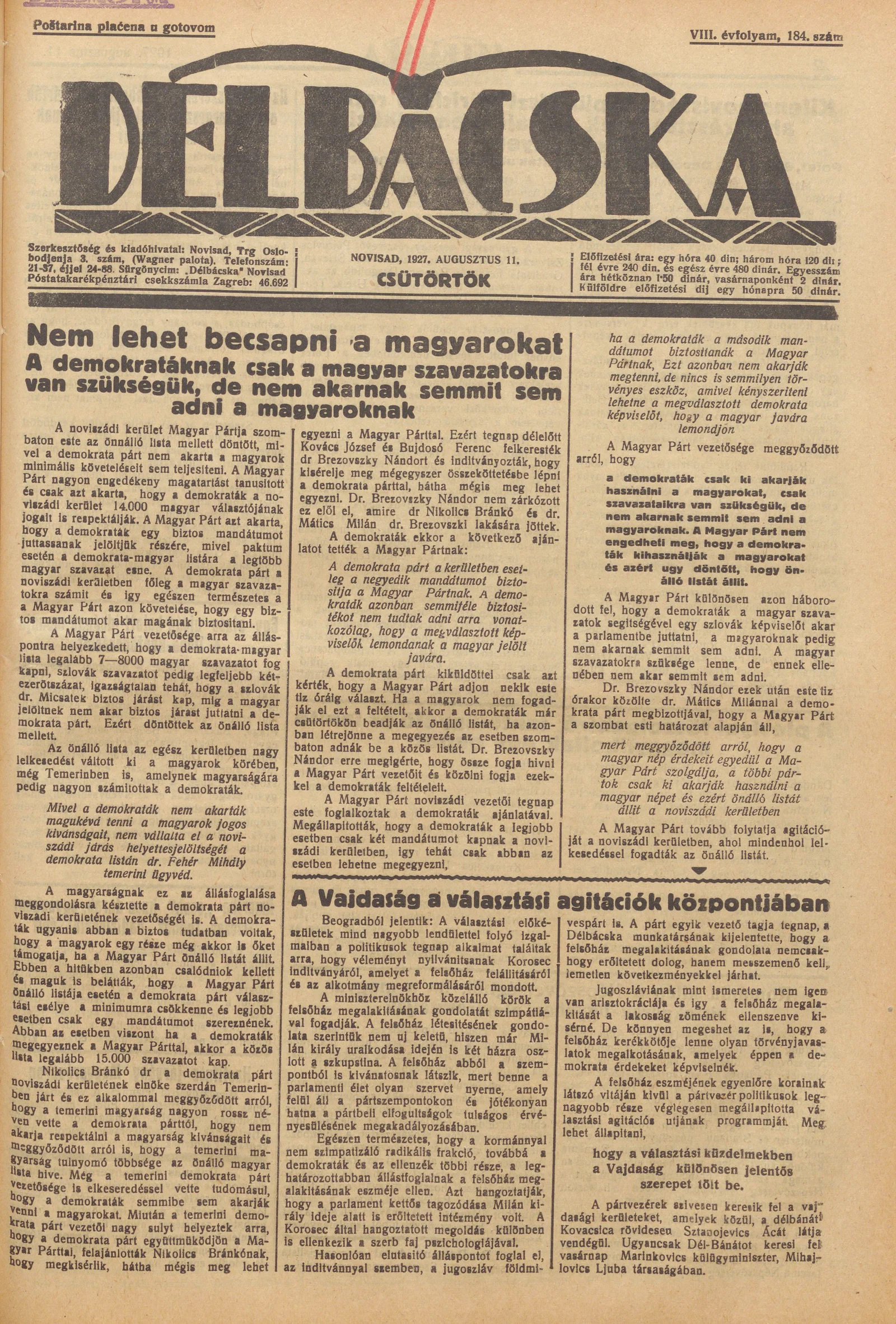 Délbácska, 8. évf. 1927. augusztus 11. 184. sz.