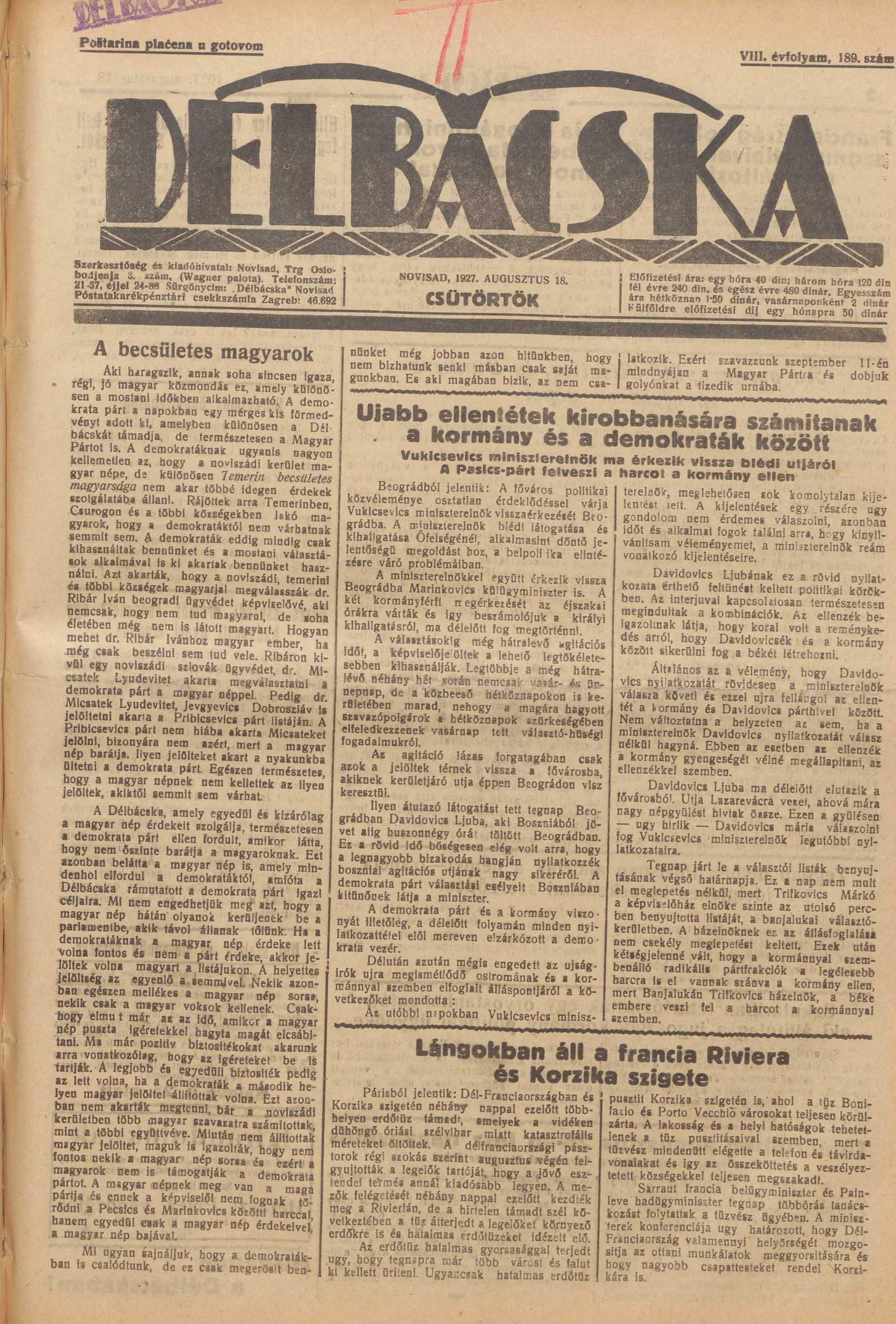 Délbácska, 8. évf. 1927. augusztus 18. 189. sz.