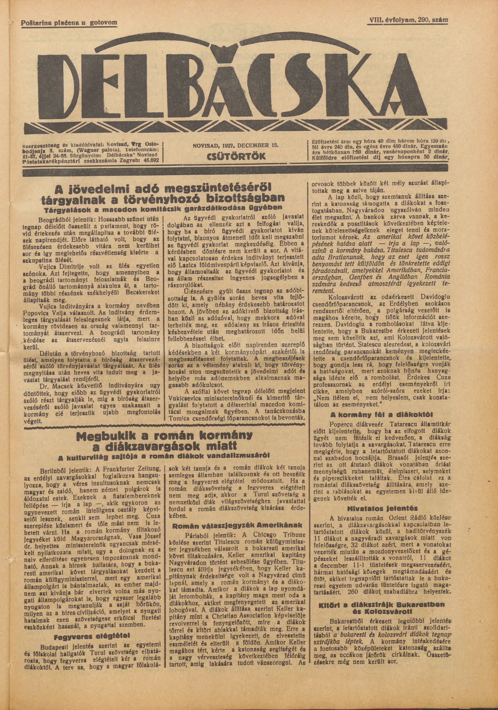 Délbácska, 8. évf. 1927. december 15. 290. sz.