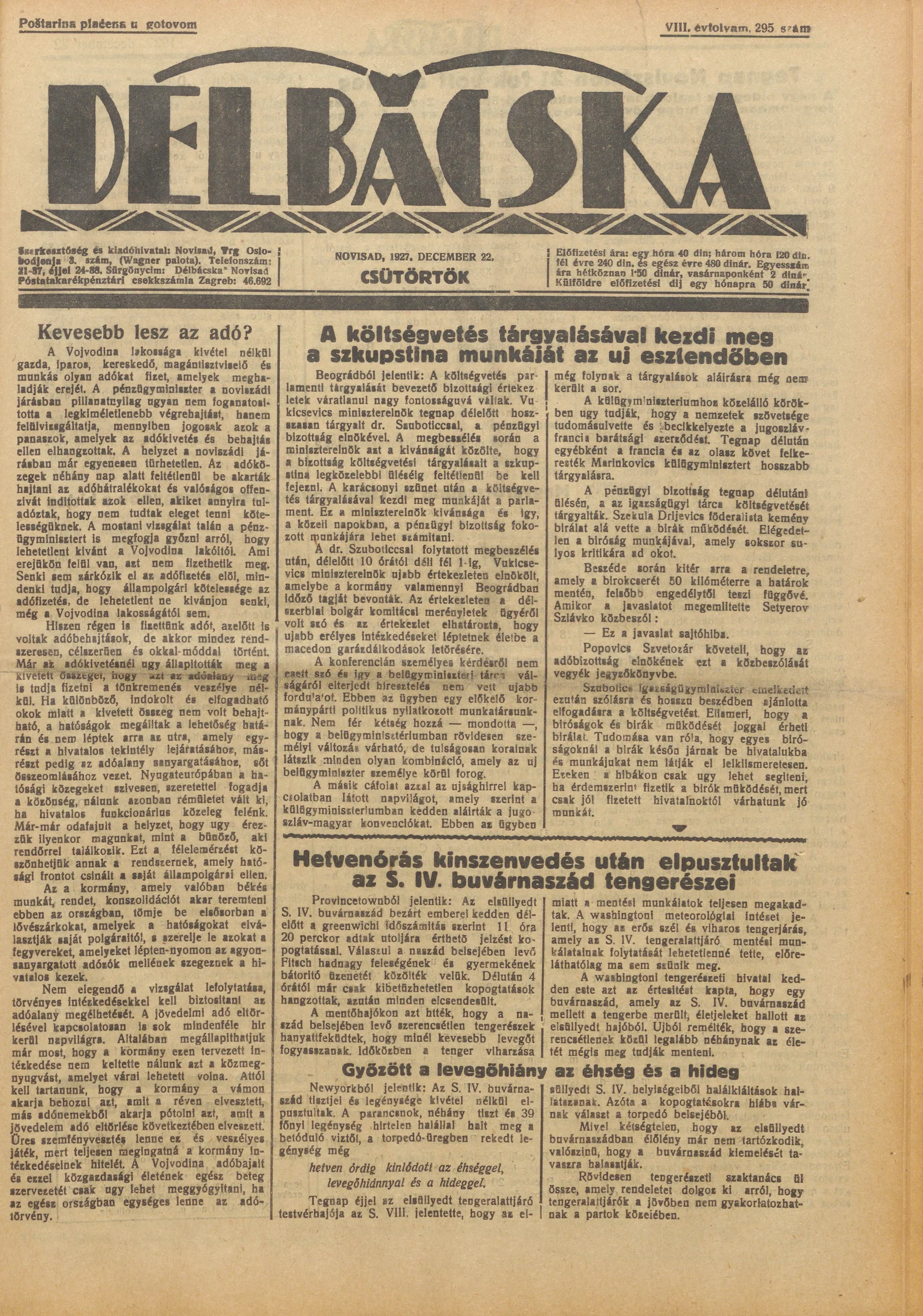 Délbácska, 8. évf. 1927. december 22. 295. sz.