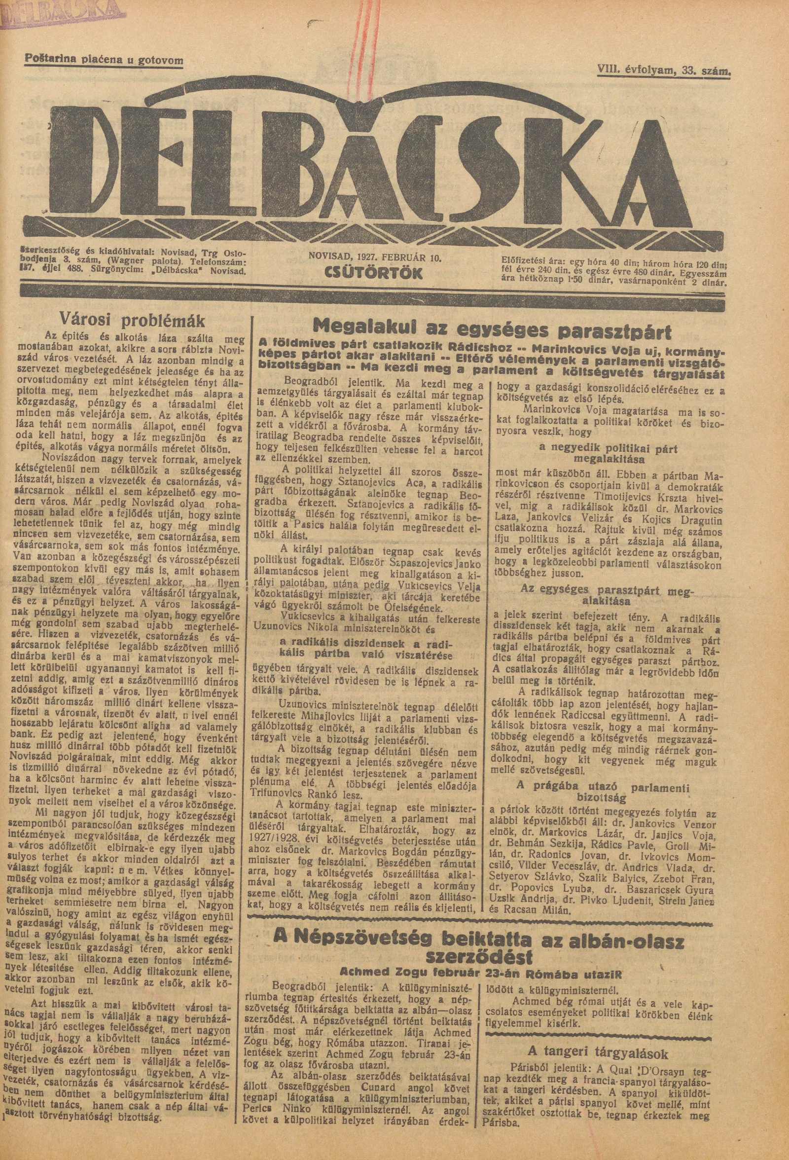 Délbácska, 8. évf. 1927. február 10. 33. sz.
