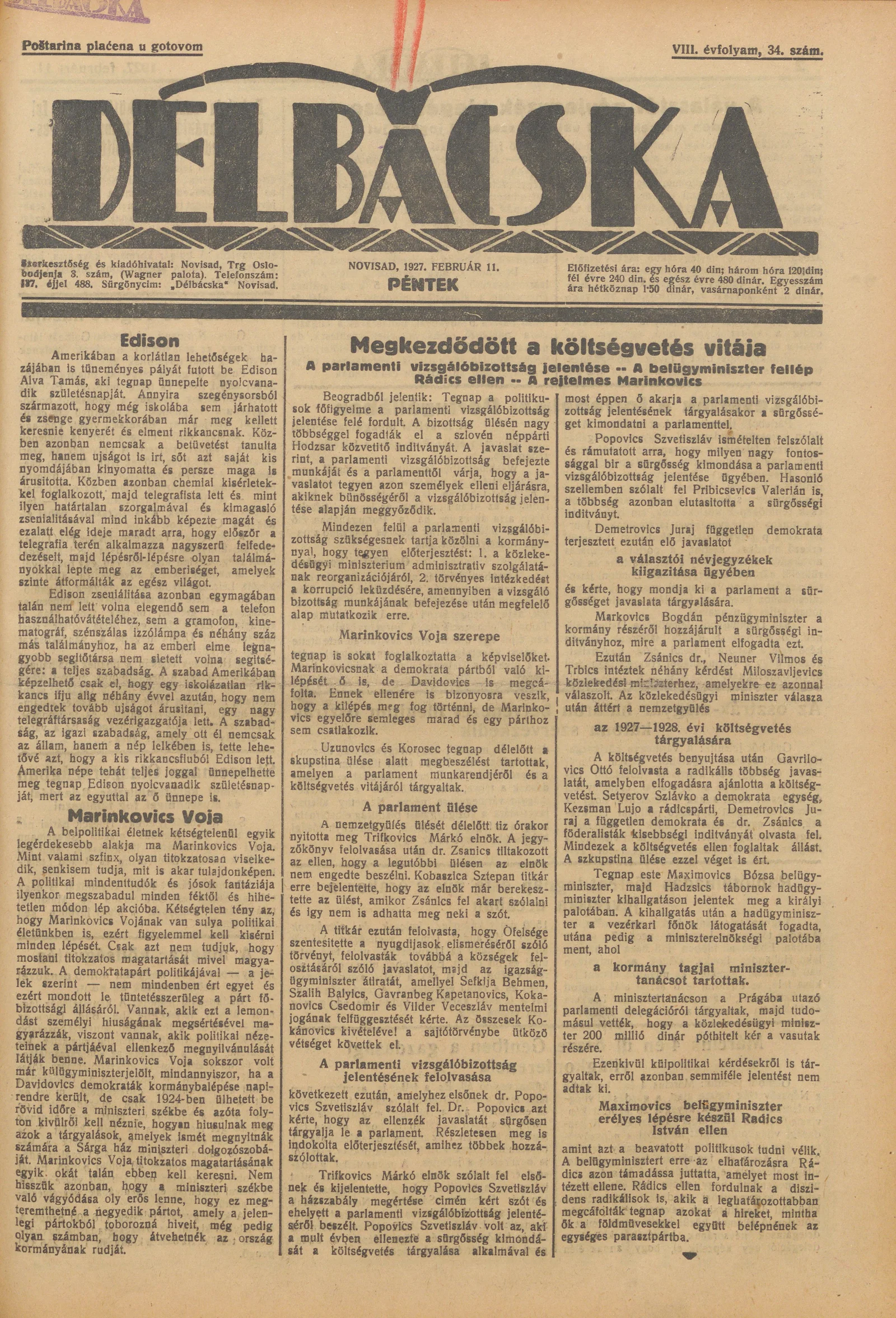 Délbácska, 8. évf. 1927. február 11. 34. sz.