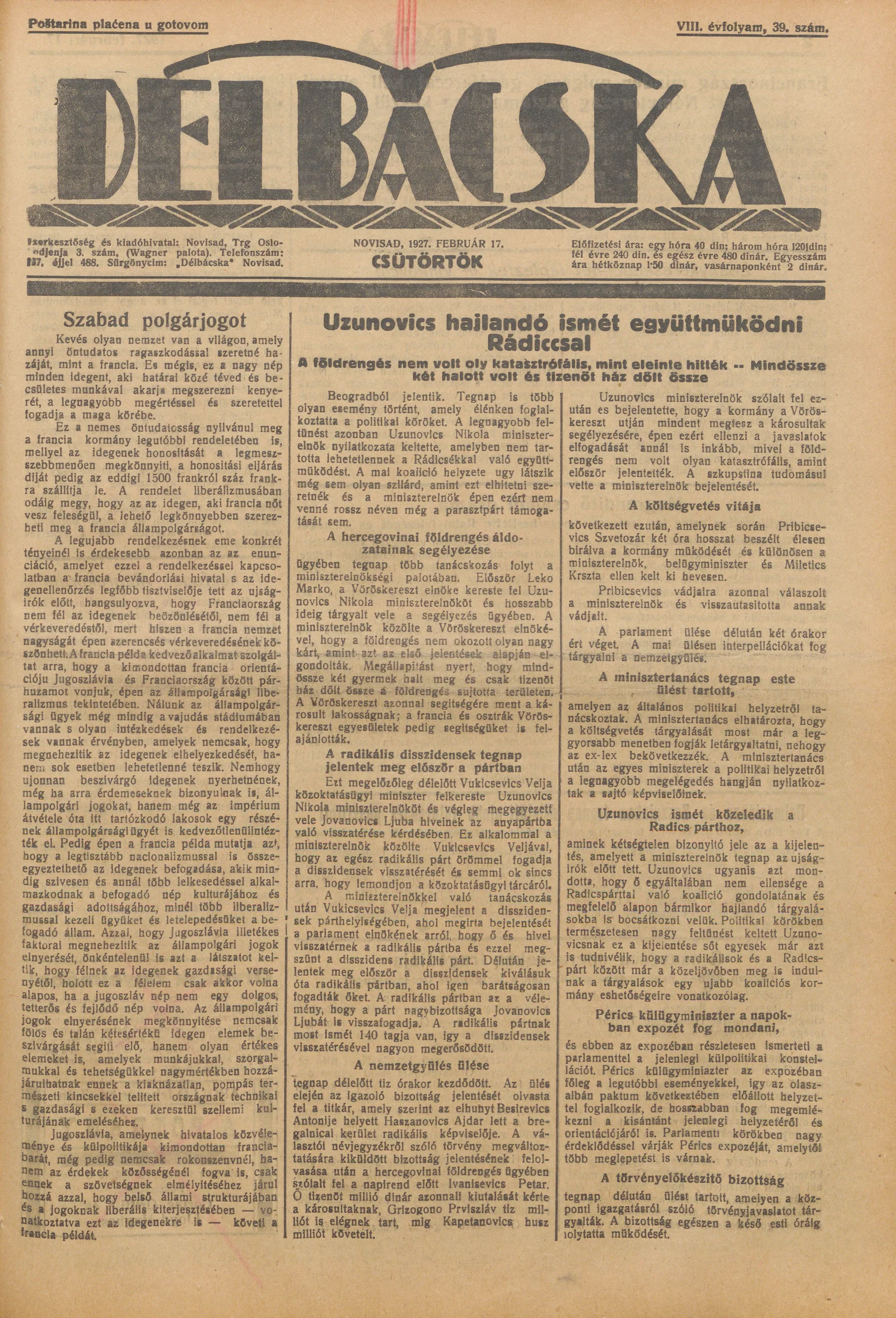 Délbácska, 8. évf. 1927. február 17. 39. sz.