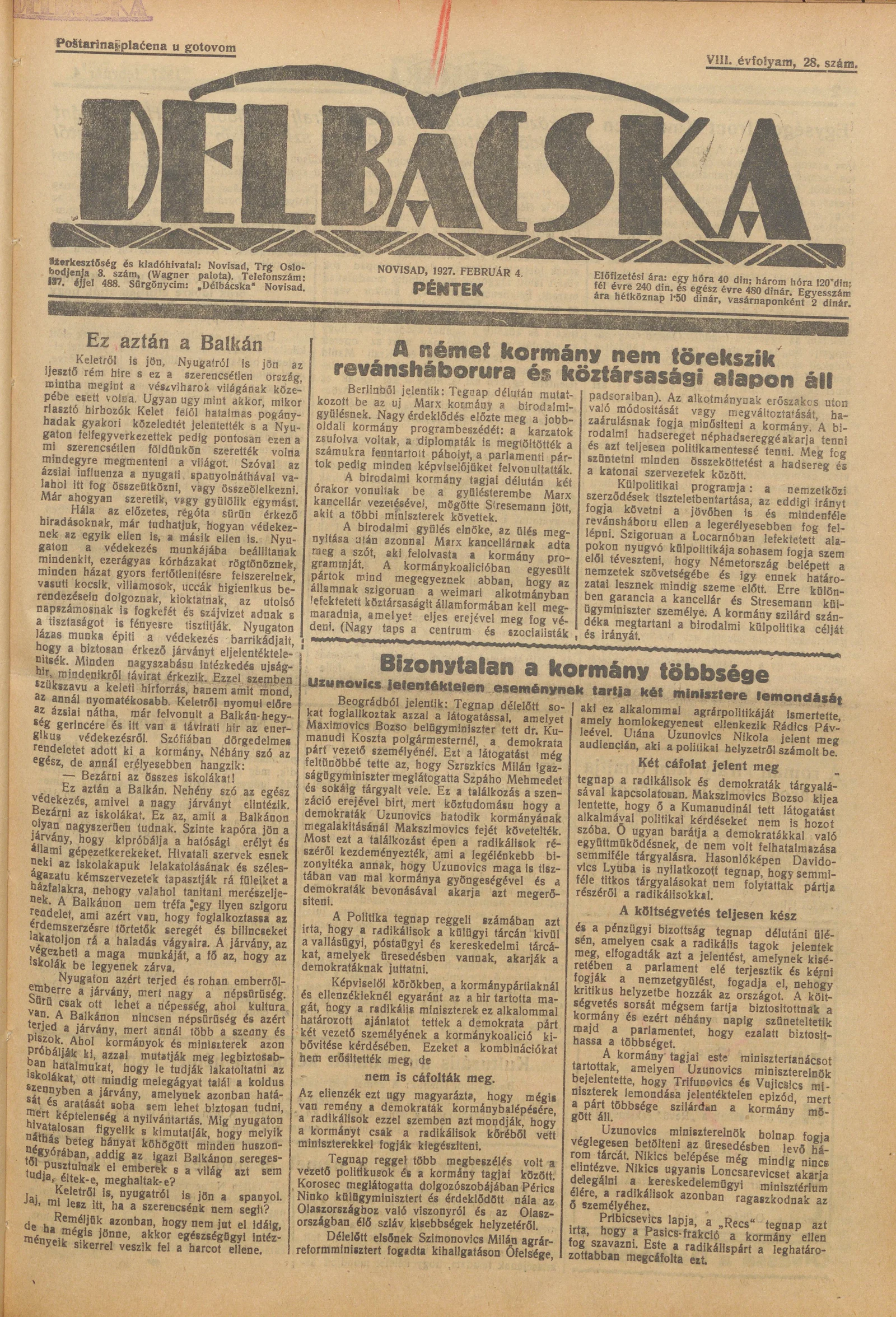 Délbácska, 8. évf. 1927. február 4. 28. sz.