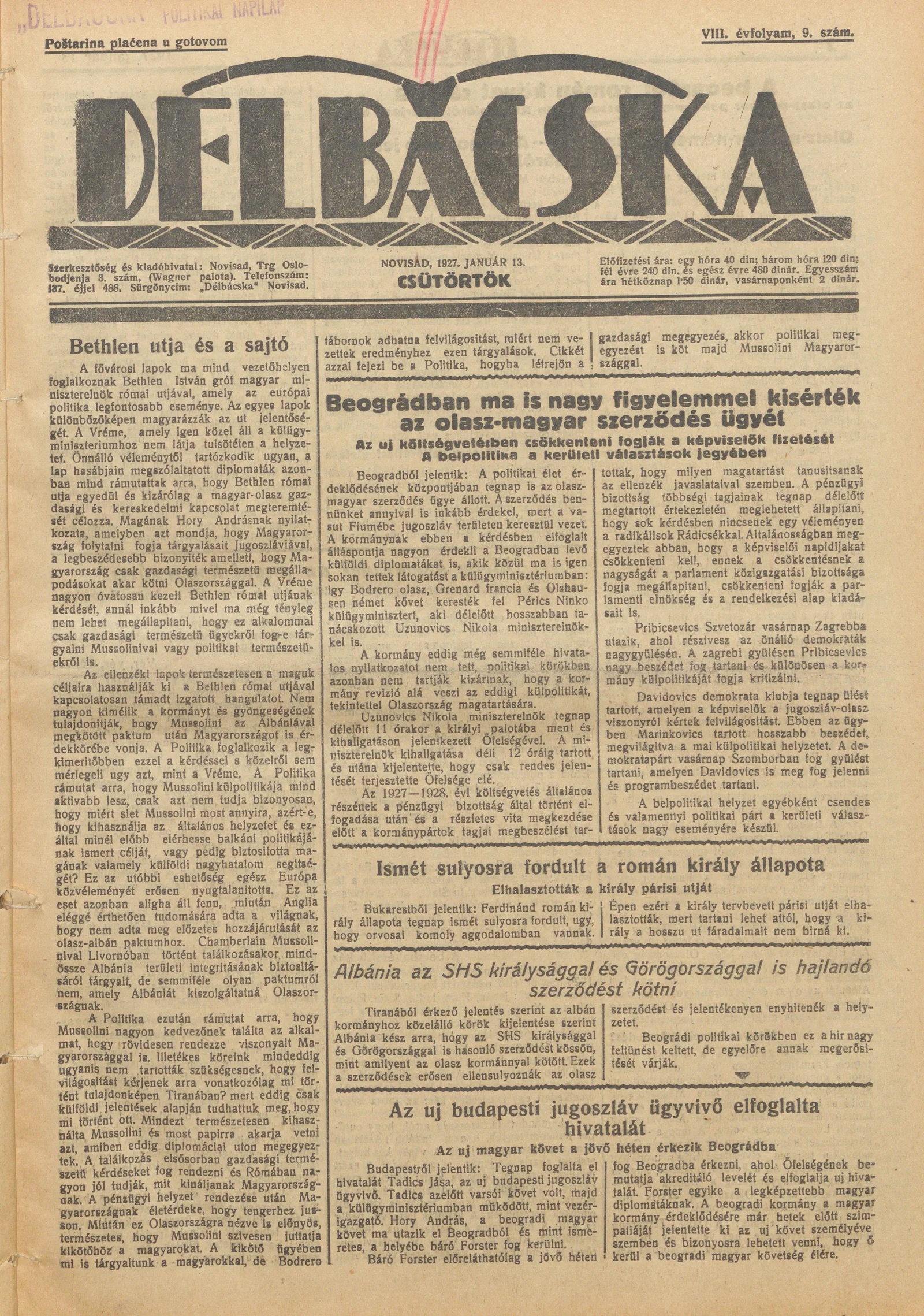 Délbácska, 8. évf. 1927. január 13. 9. sz.