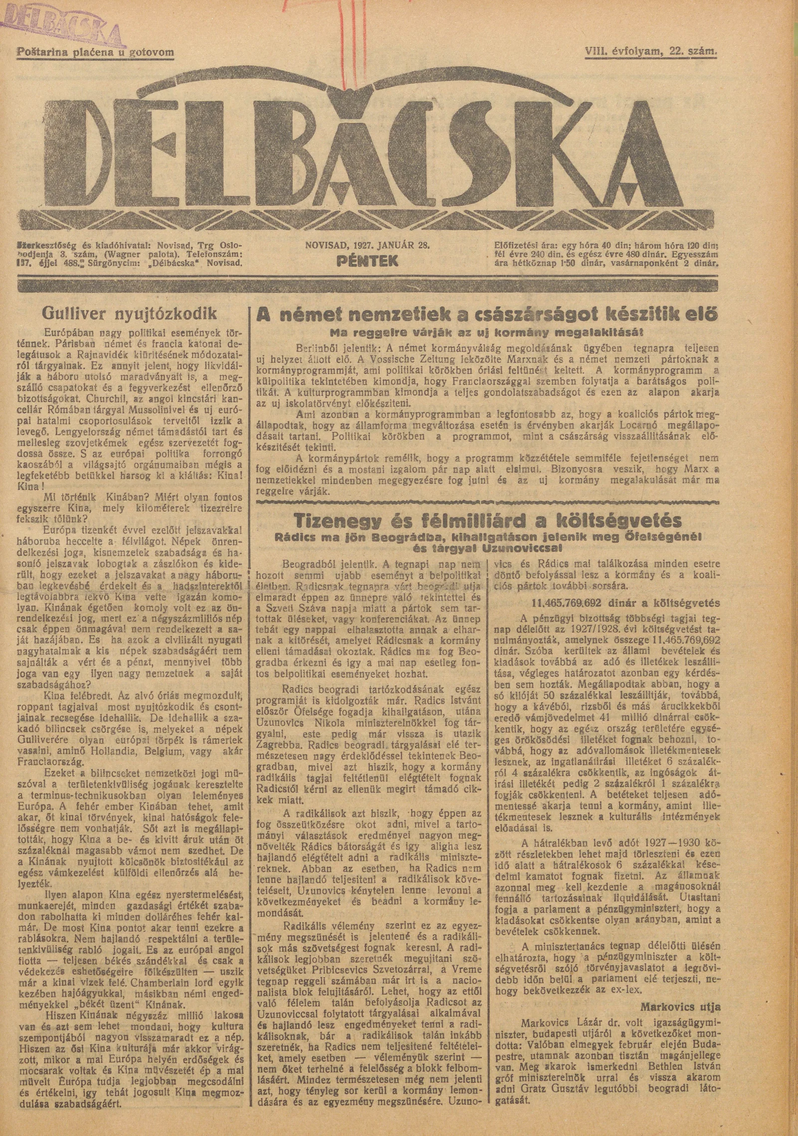 Délbácska, 8. évf. 1927. január 28. 22. sz.