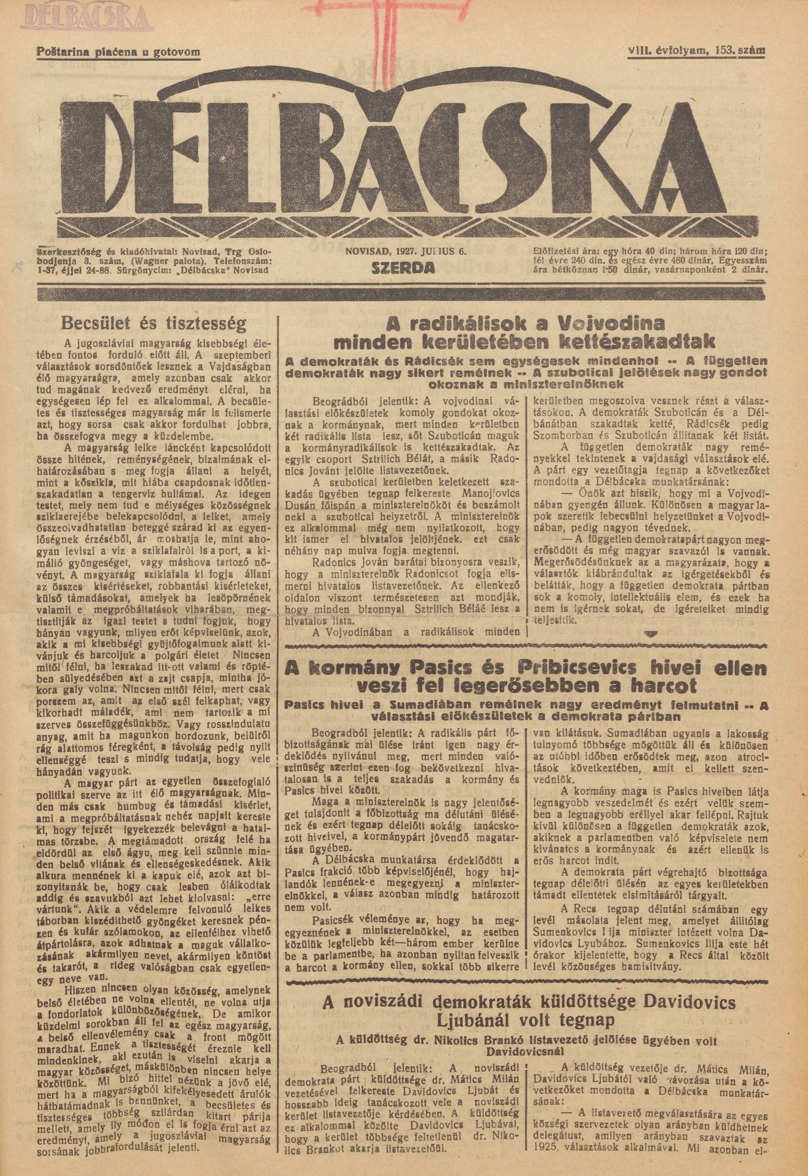 Délbácska, 8. évf. 1927. július 6. 153. sz.