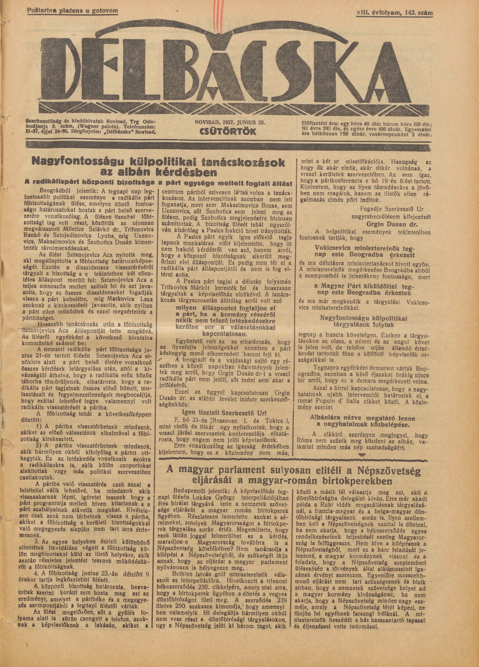 Délbácska, 8. évf. 1927. június 23. 143. sz.
