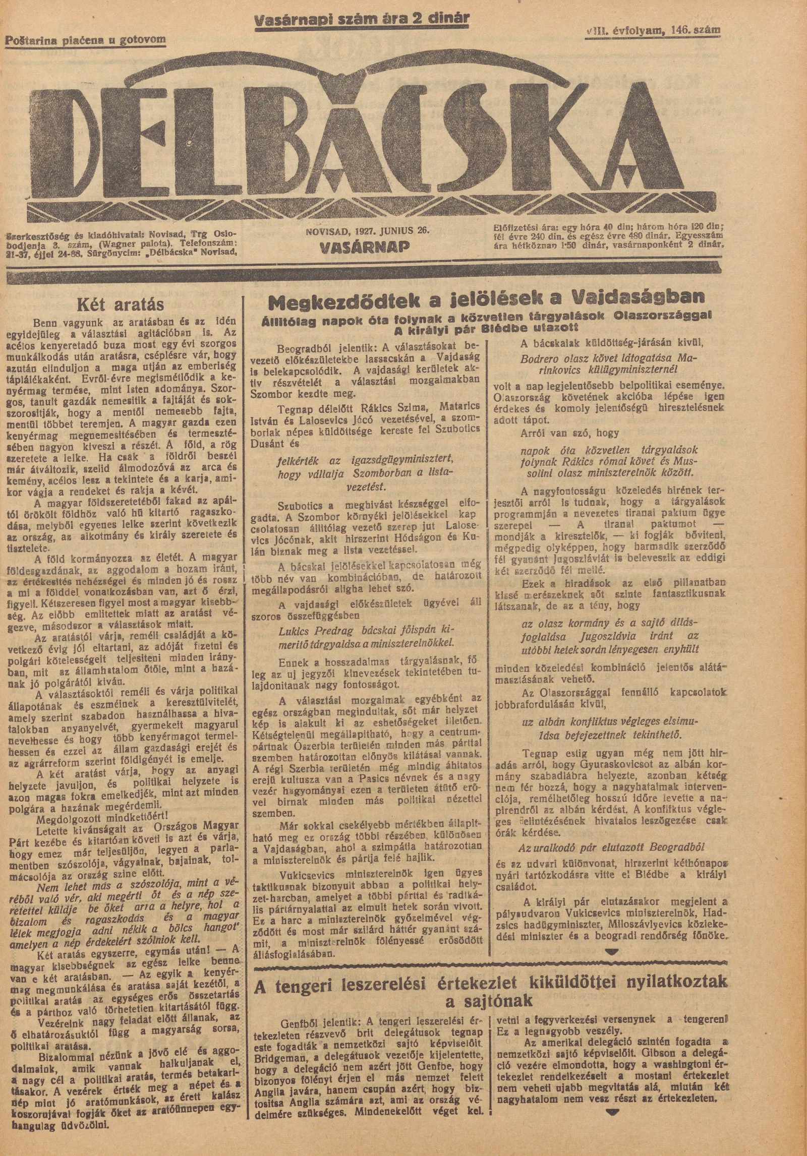 Délbácska, 8. évf. 1927. június 26. 146. sz.