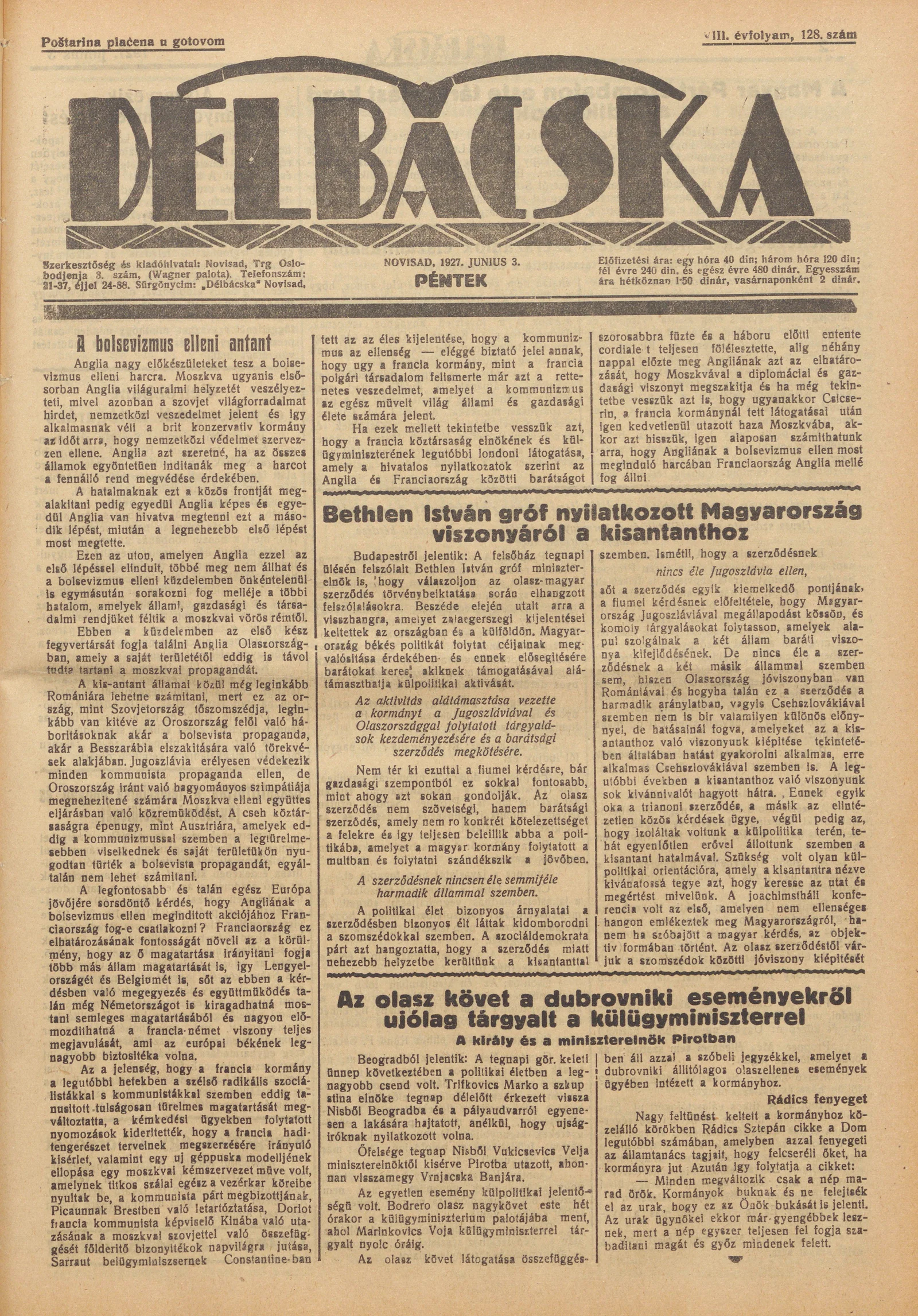 Délbácska, 8. évf. 1927. június 3. 128. sz.