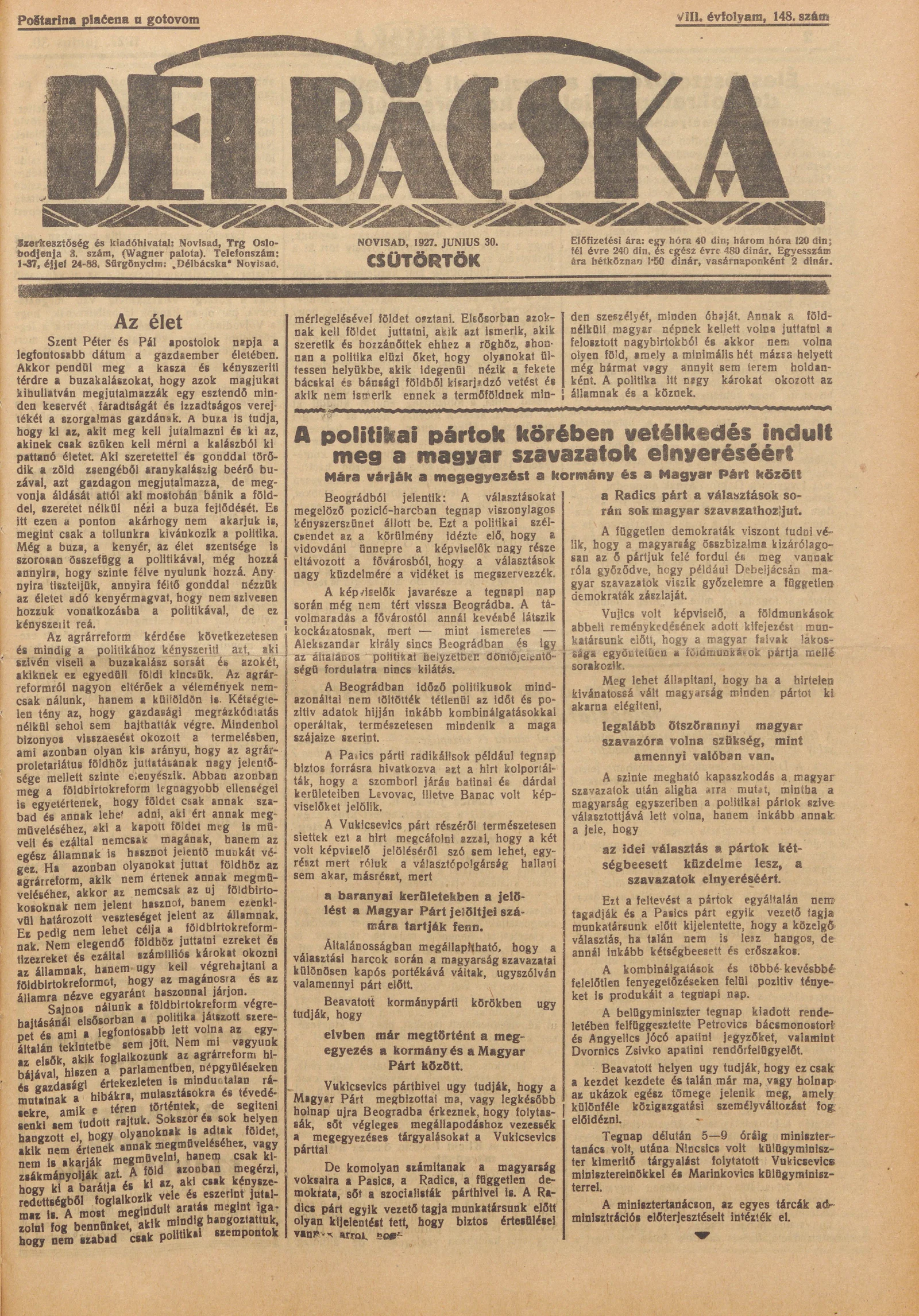 Délbácska, 8. évf. 1927. június 30. 148. sz.