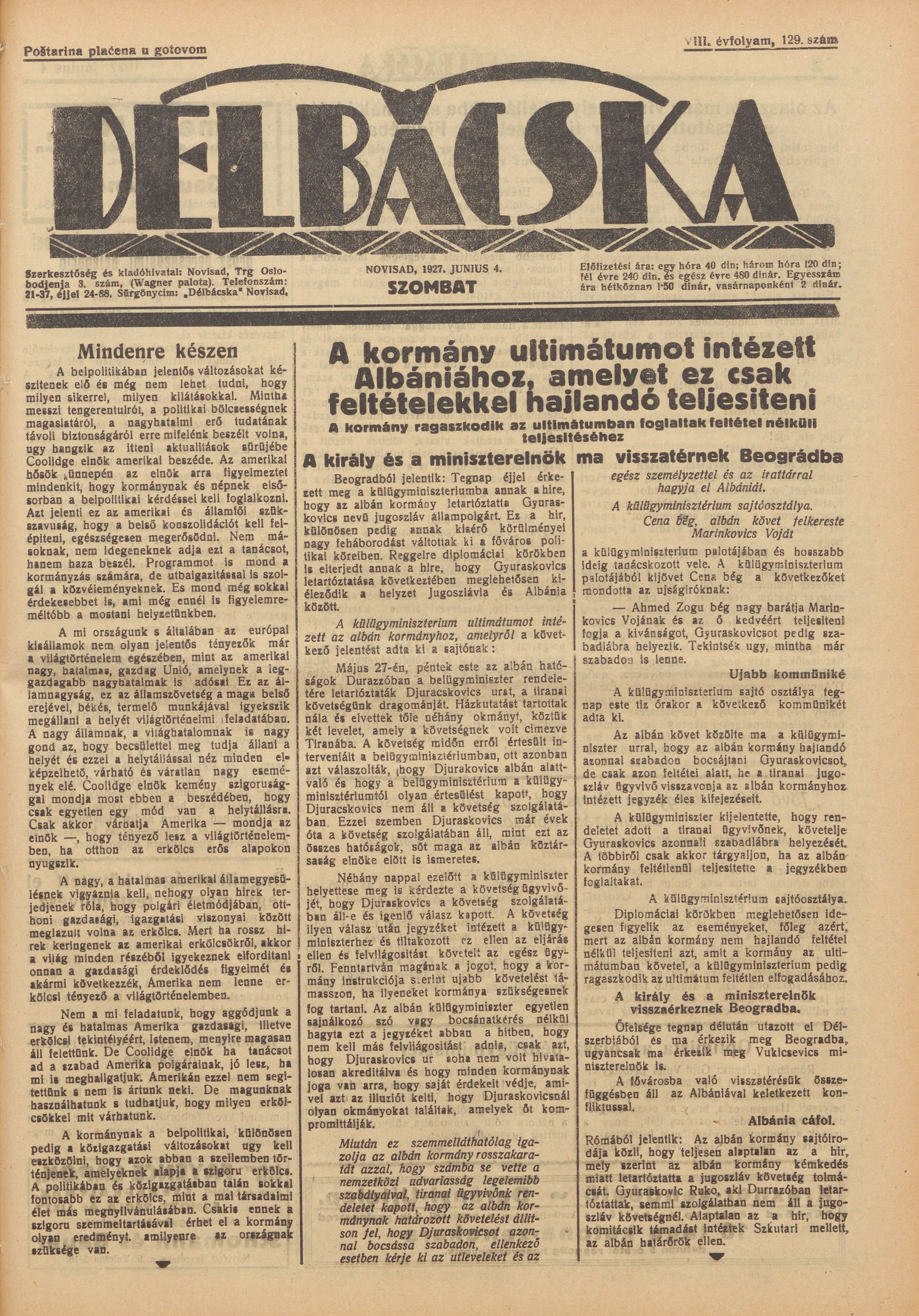 Délbácska, 8. évf. 1927. június 4. 129. sz.