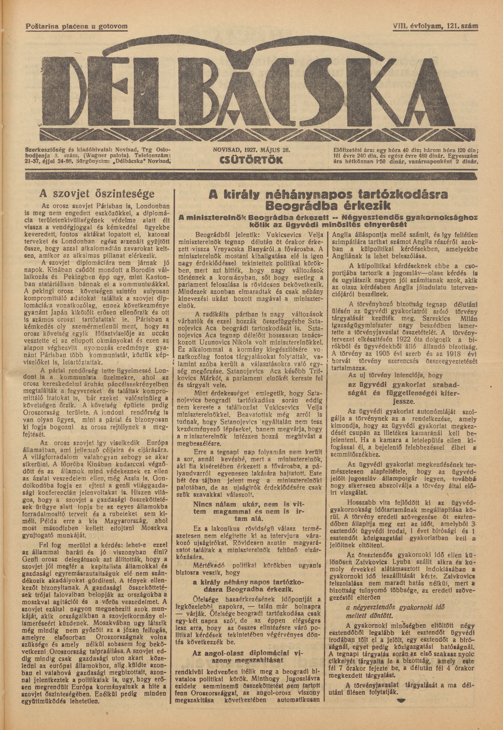 Délbácska, 8. évf. 1927. május 26. 121. sz.