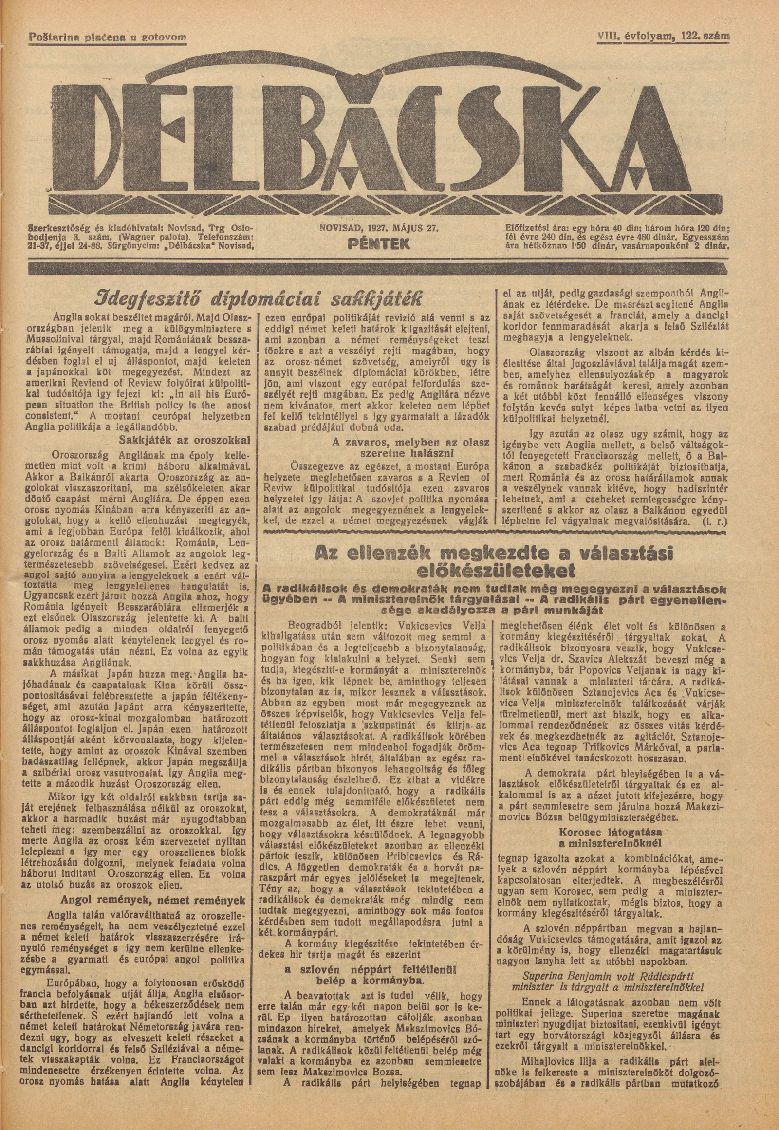 Délbácska, 8. évf. 1927. május 27. 122. sz.