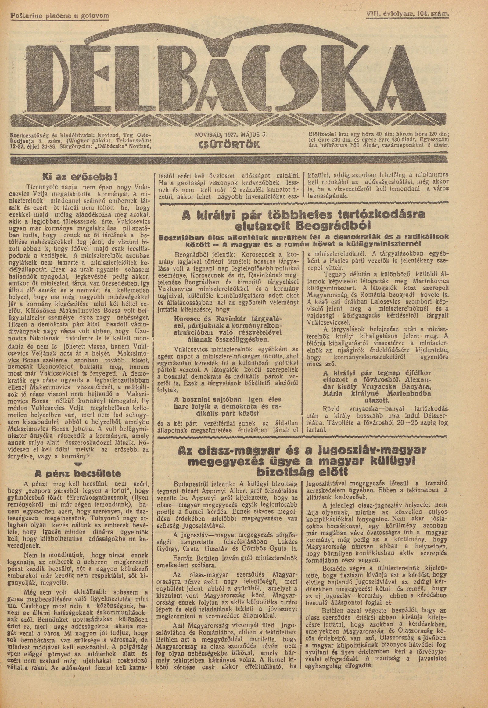 Délbácska, 8. évf. 1927. május 5. 104. sz.
