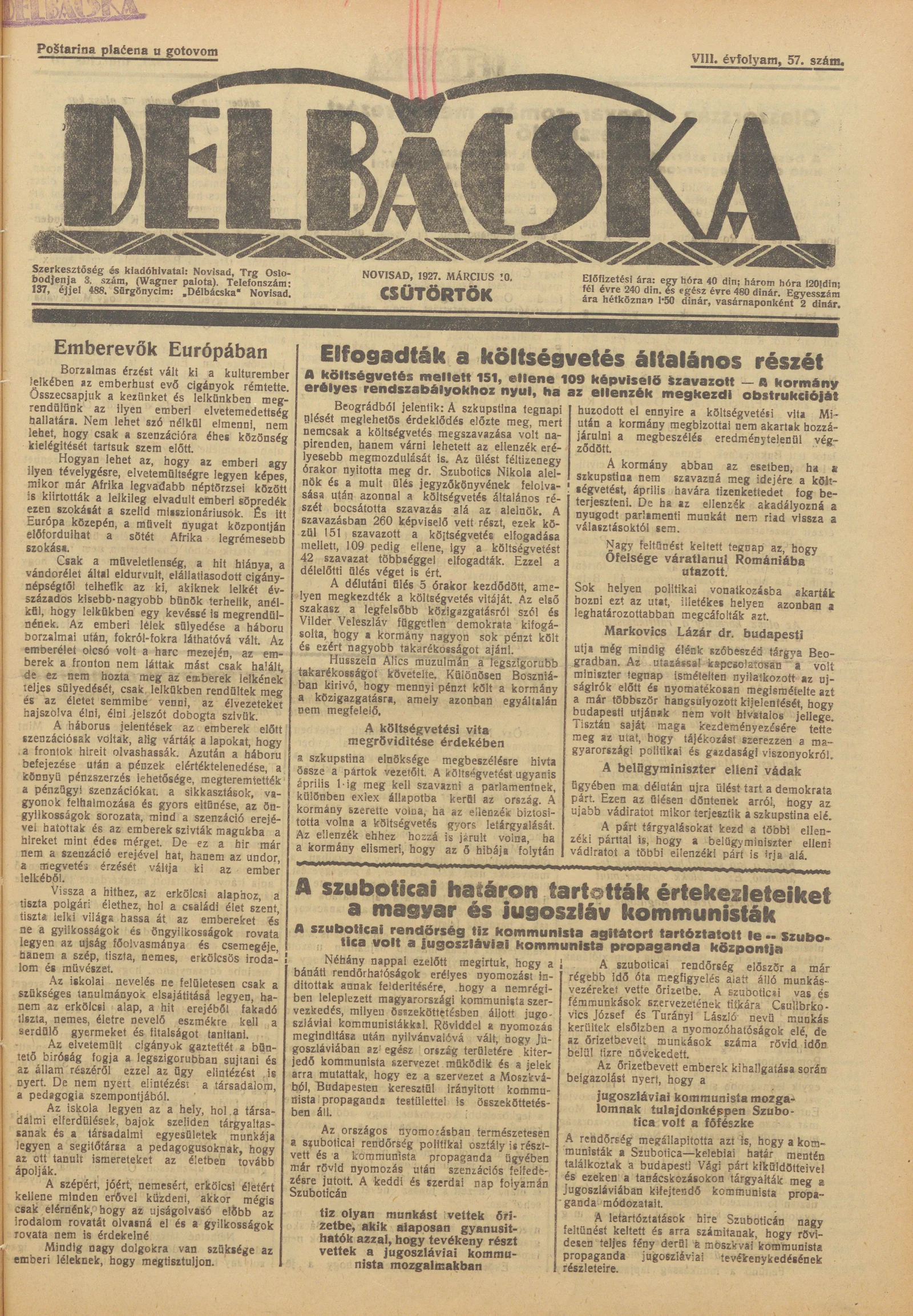 Délbácska, 8. évf. 1927. március 10. 57. sz.