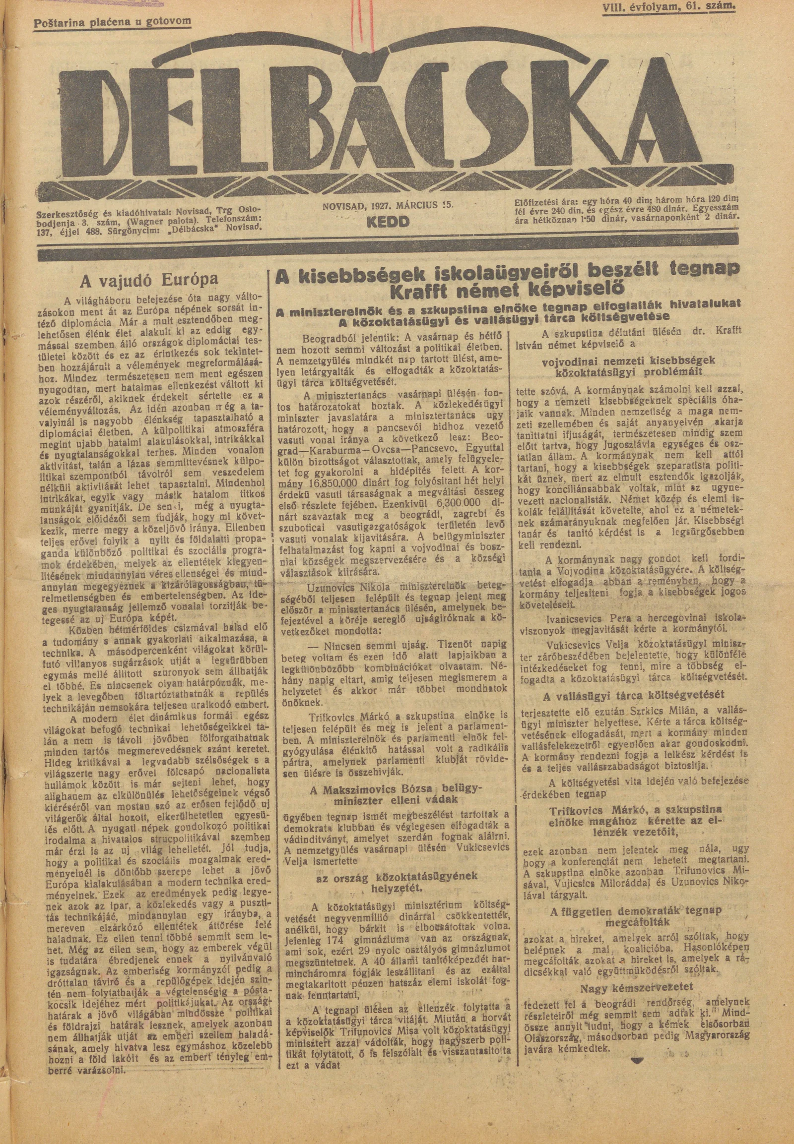 Délbácska, 8. évf. 1927. március 15. 61. sz.