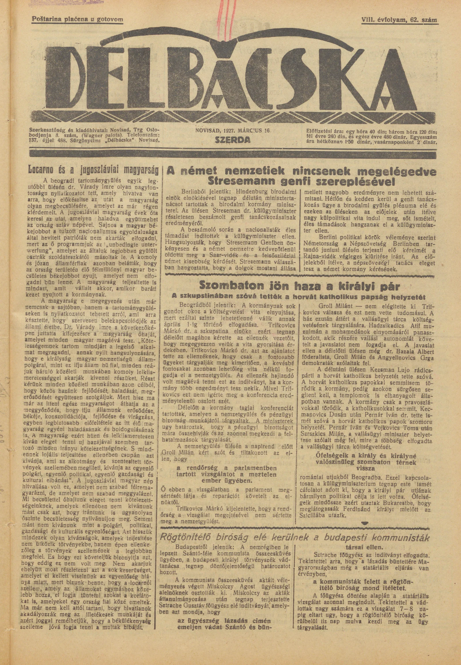 Délbácska, 8. évf. 1927. március 16. 62. sz.