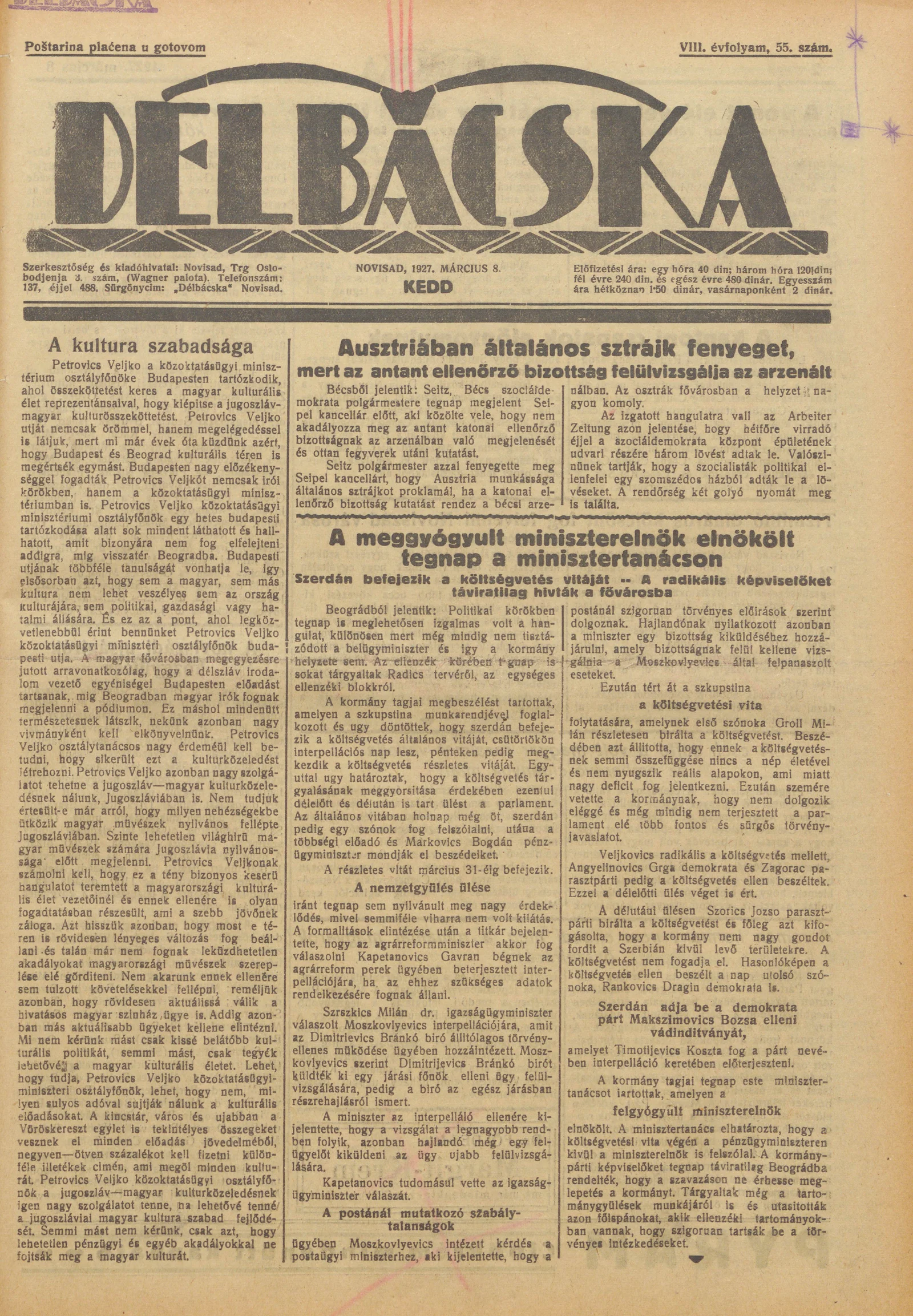 Délbácska, 8. évf. 1927. március 8. 55. sz.