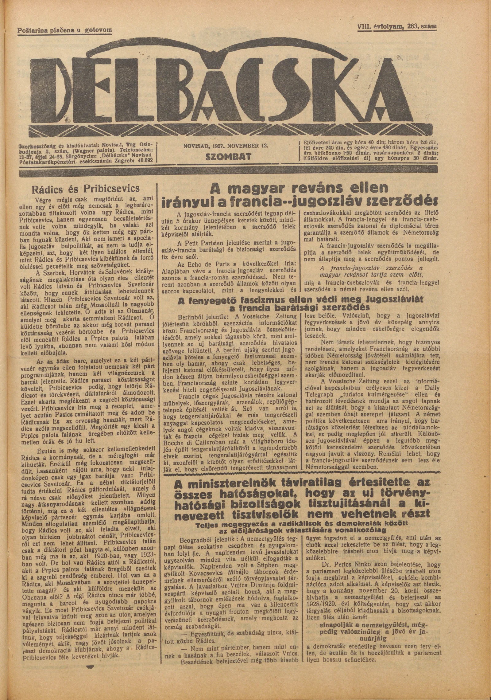 Délbácska, 8. évf. 1927. november 12. 263. sz.