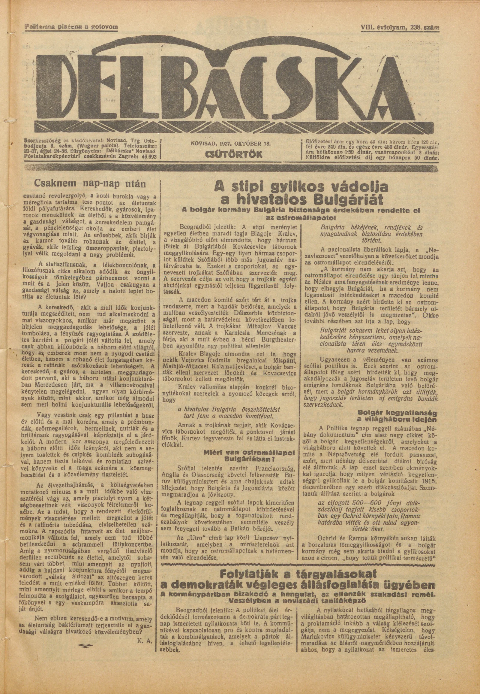 Délbácska, 8. évf. 1927. október 13. 238. sz.