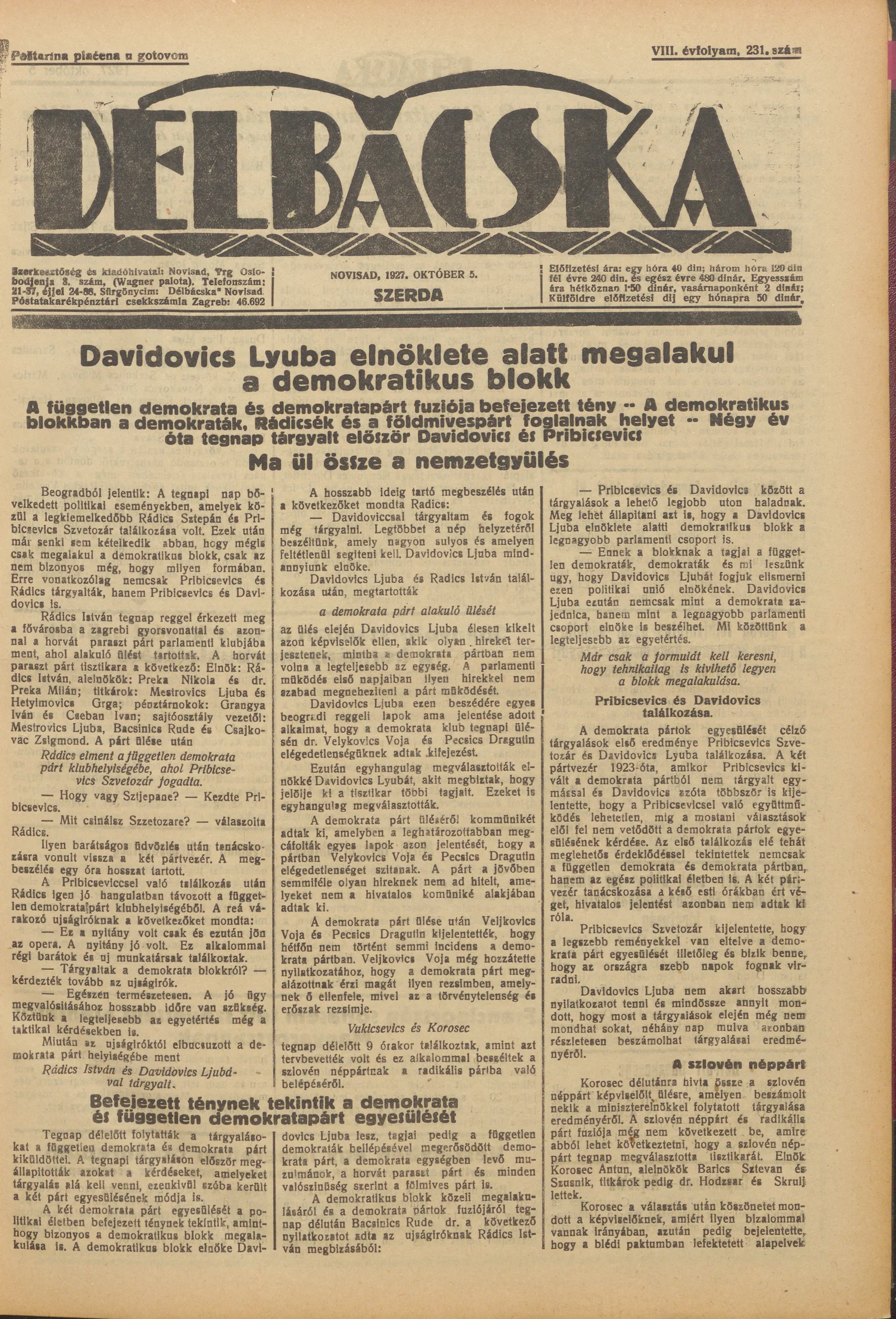 Délbácska, 8. évf. 1927. október 5. 231. sz.