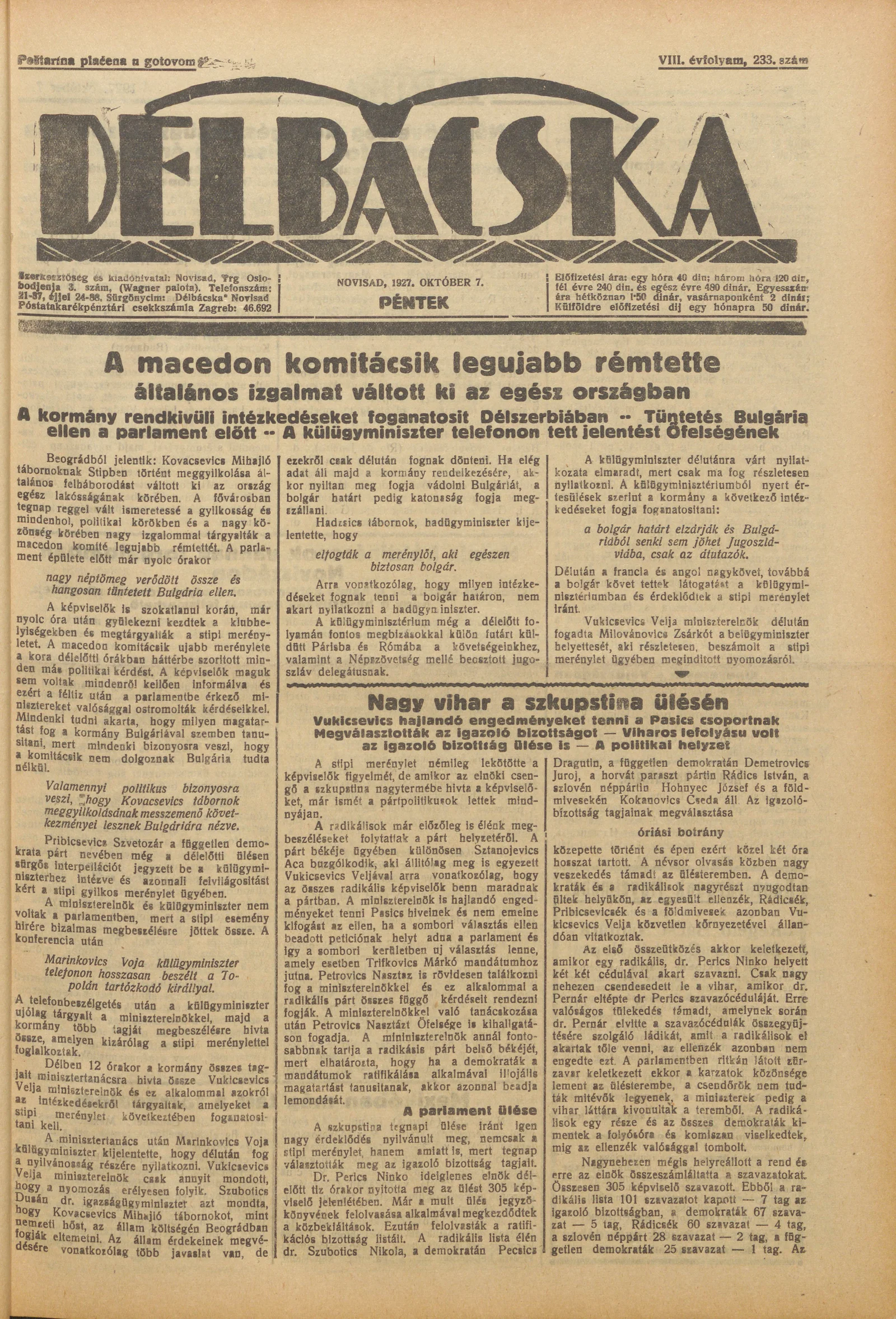 Délbácska, 8. évf. 1927. október 7. 233. sz.