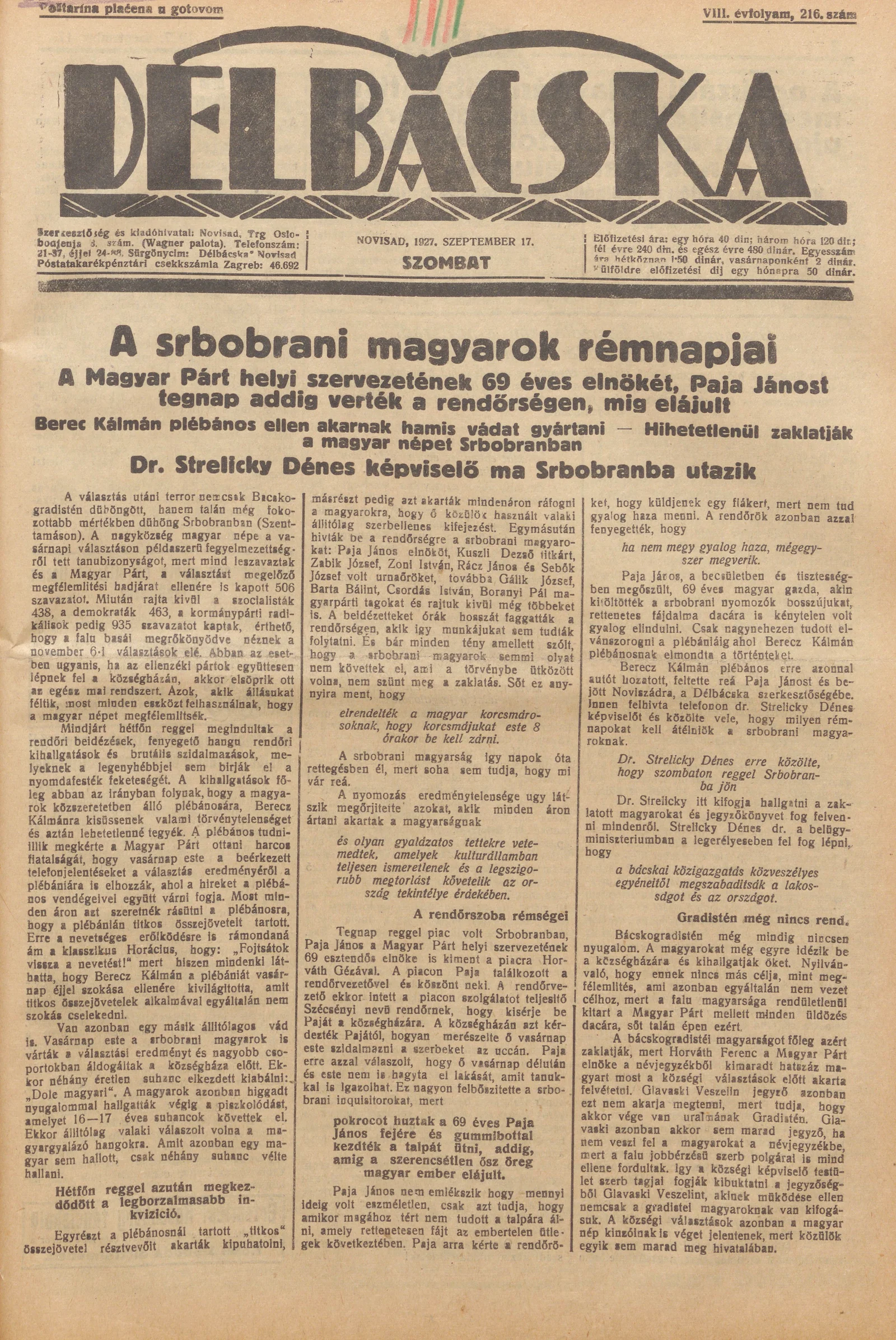 Délbácska, 8. évf. 1927. szeptember 17. 216. sz.