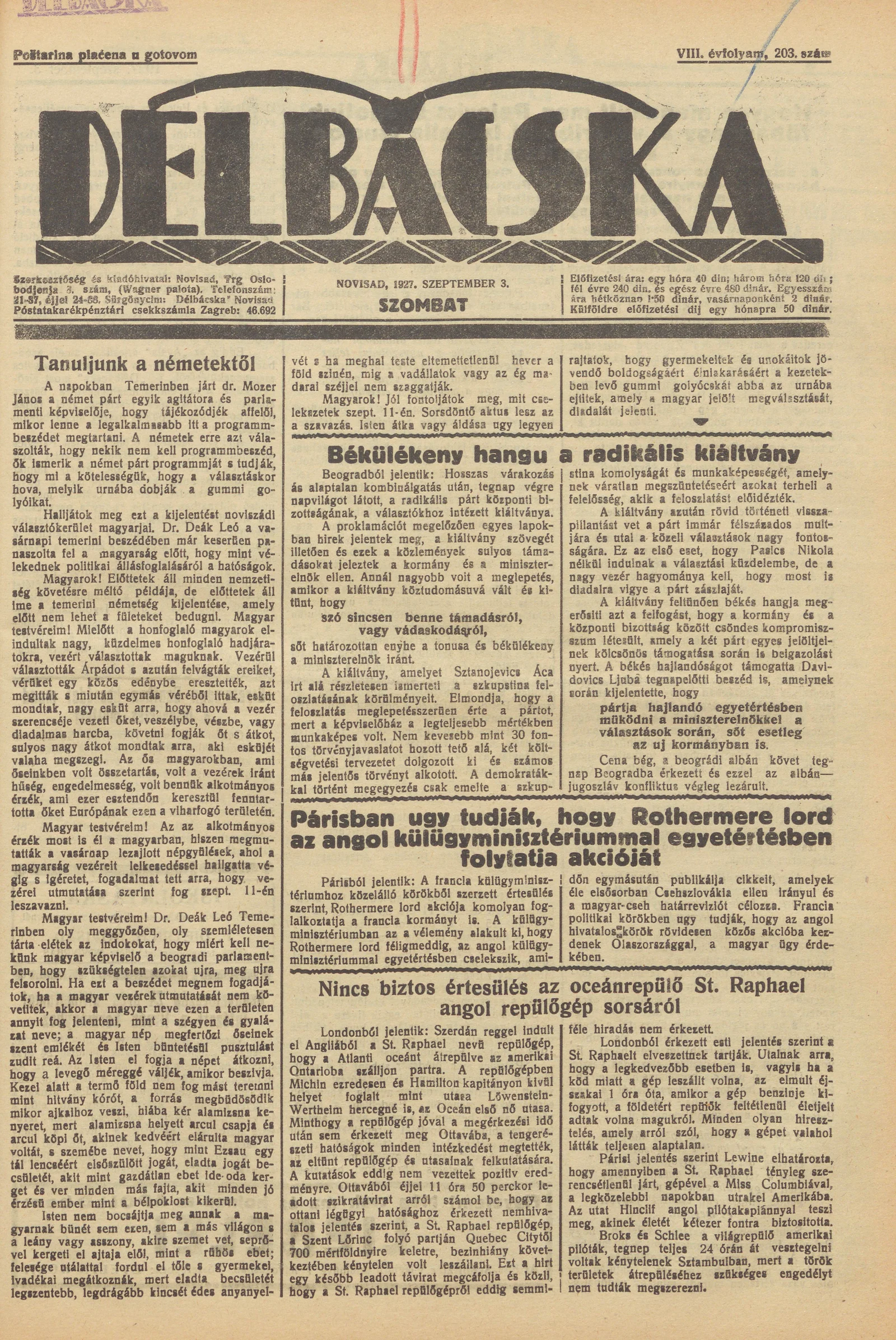 Délbácska, 8. évf. 1927. szeptember 3. 203. sz.