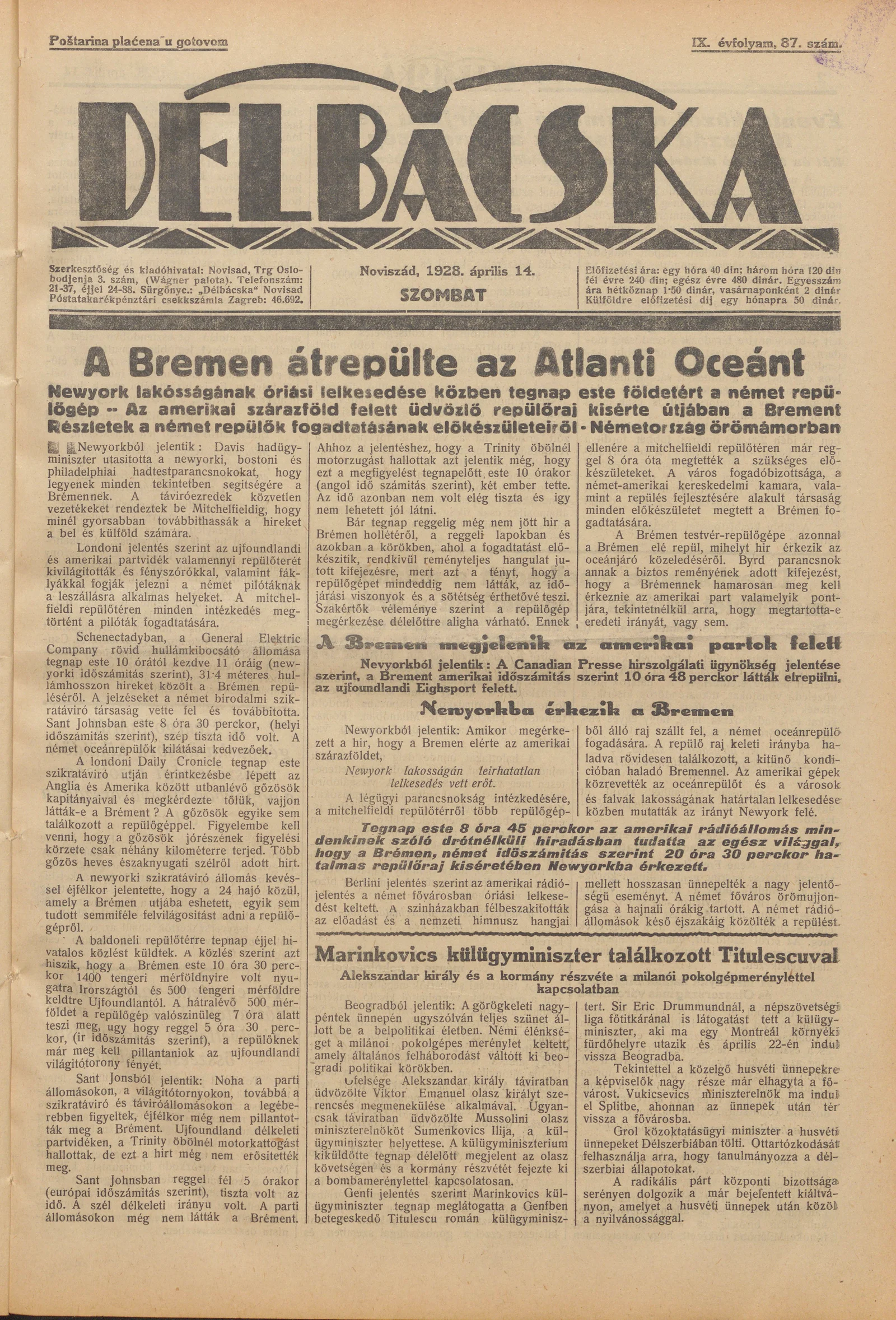 Délbácska, 9. évf. 1928. április 14. 87. sz.