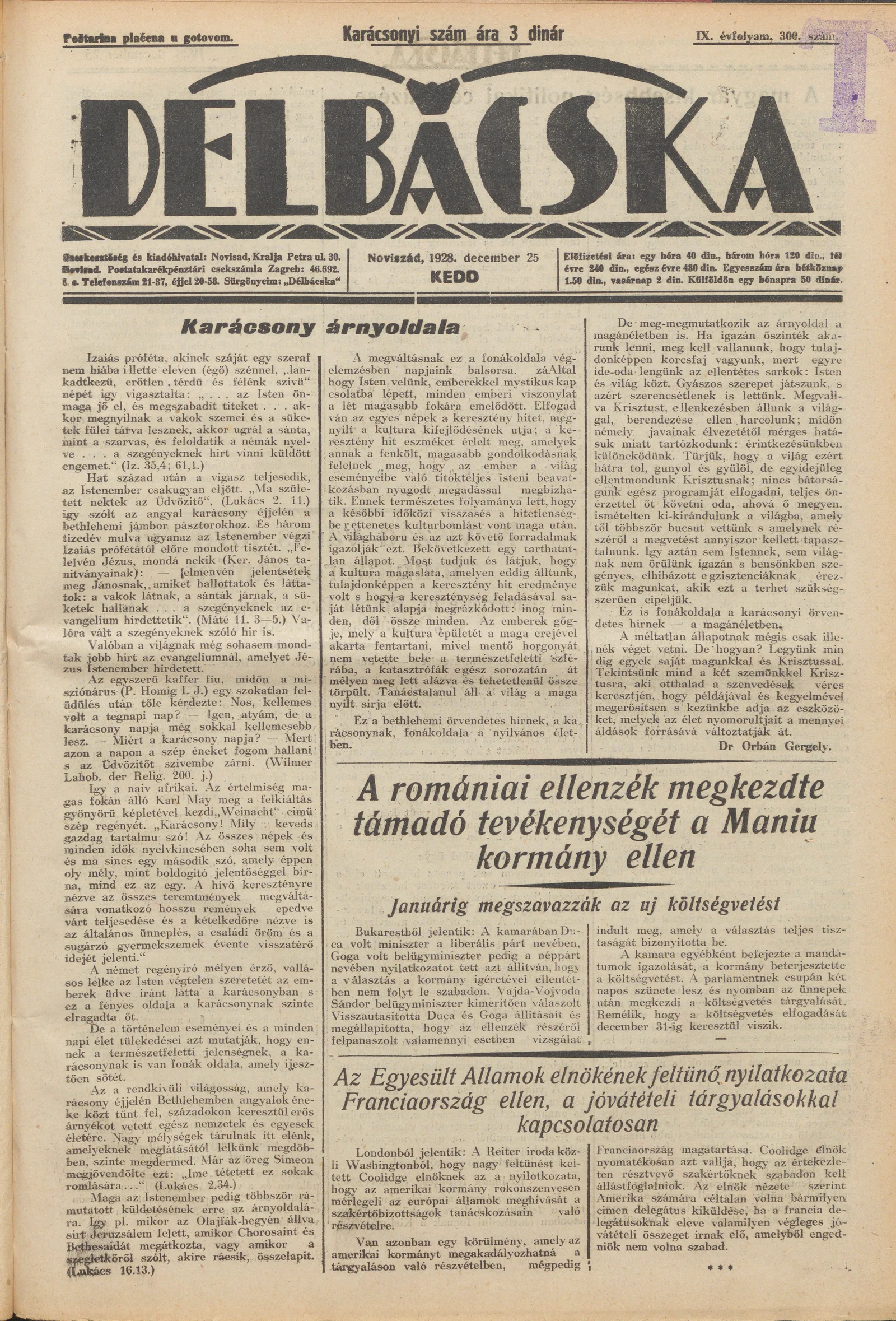 Délbácska, 9. évf. 1928. december 25. 300. sz.