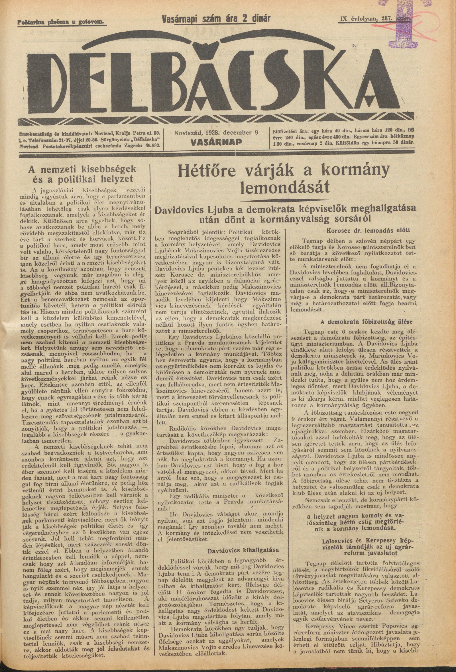 Délbácska, 9. évf. 1928. december 9. 287. sz.