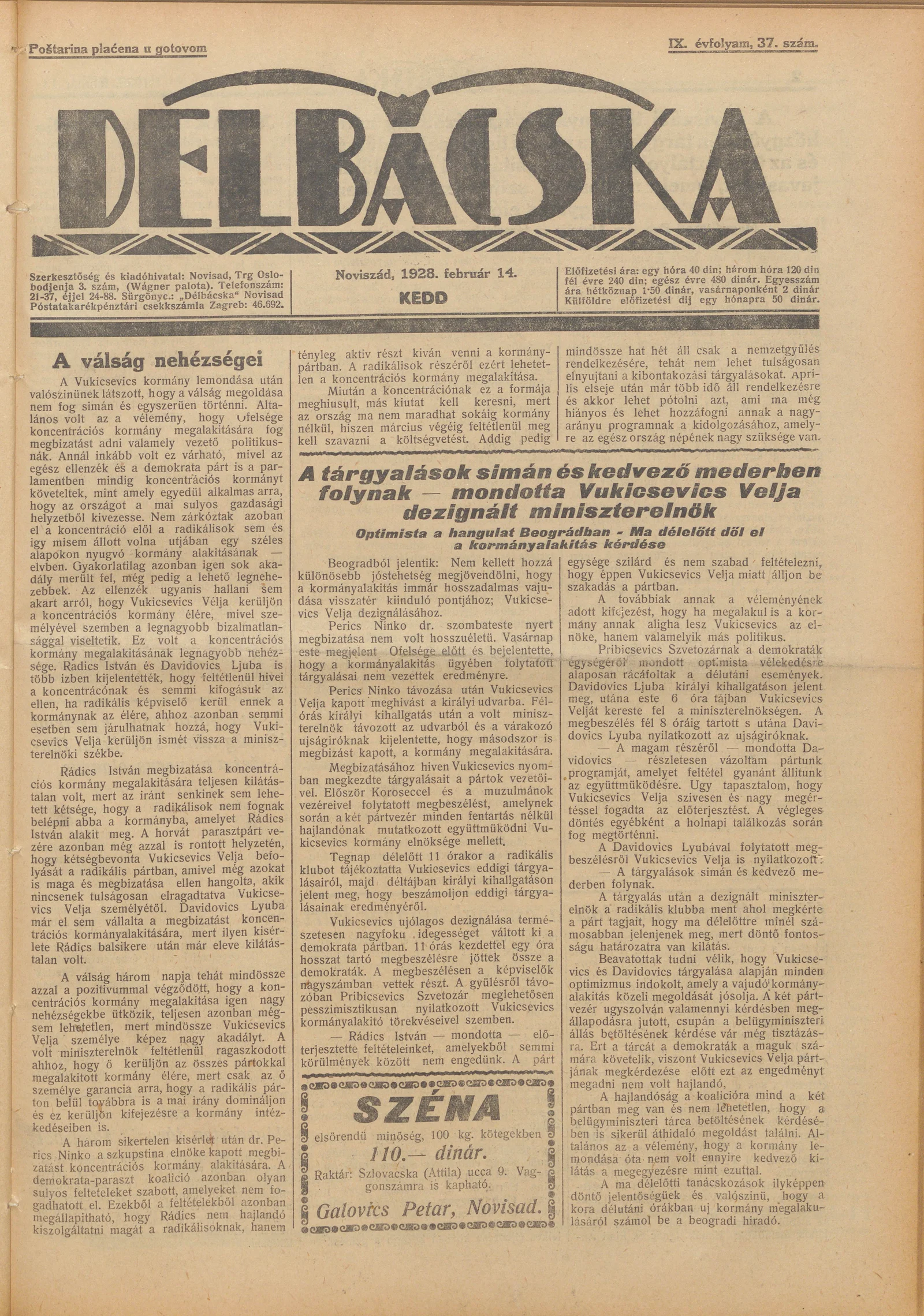 Délbácska, 9. évf. 1928. február 14. 37. sz.