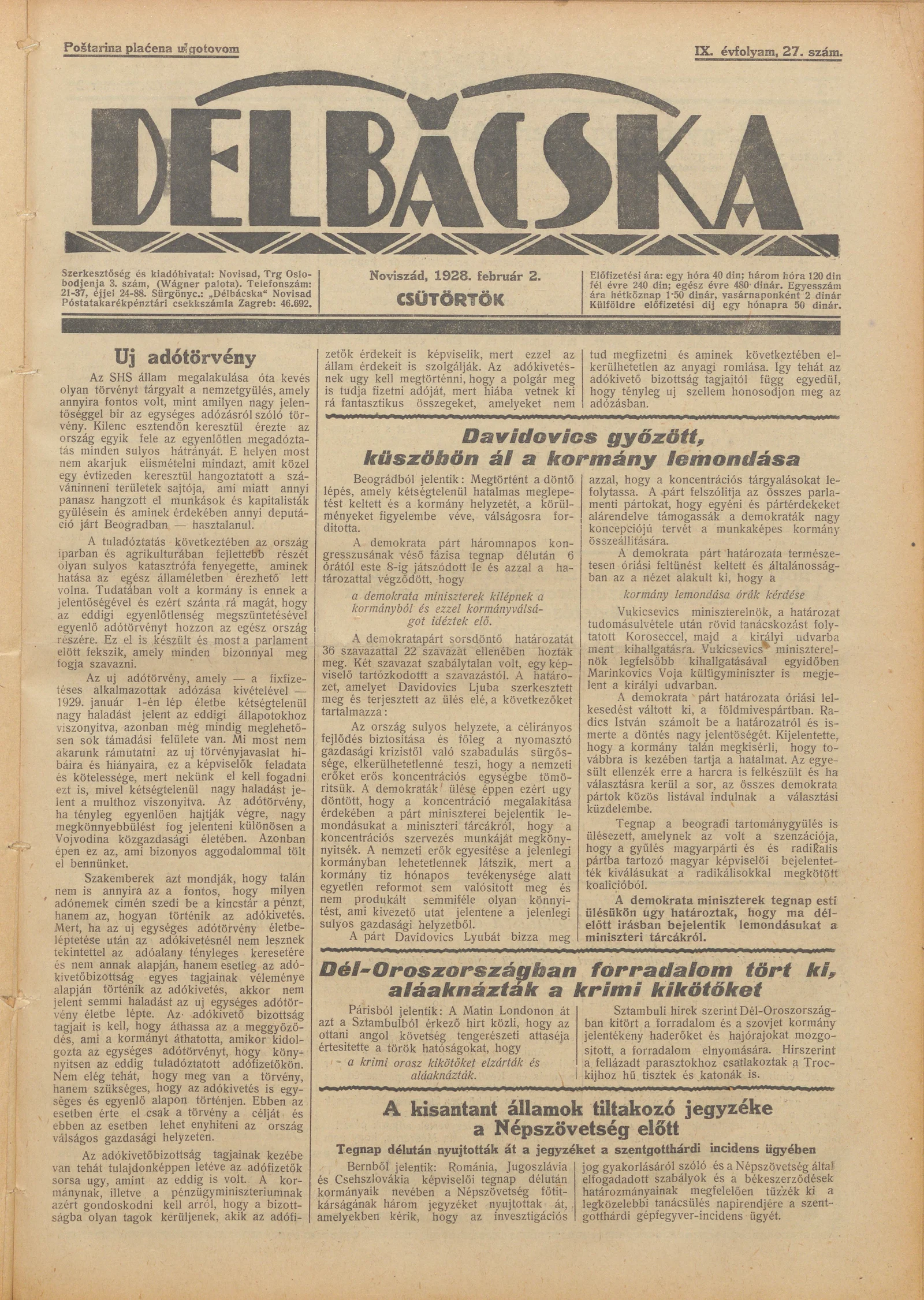 Délbácska, 9. évf. 1928. február 2. 27. sz.