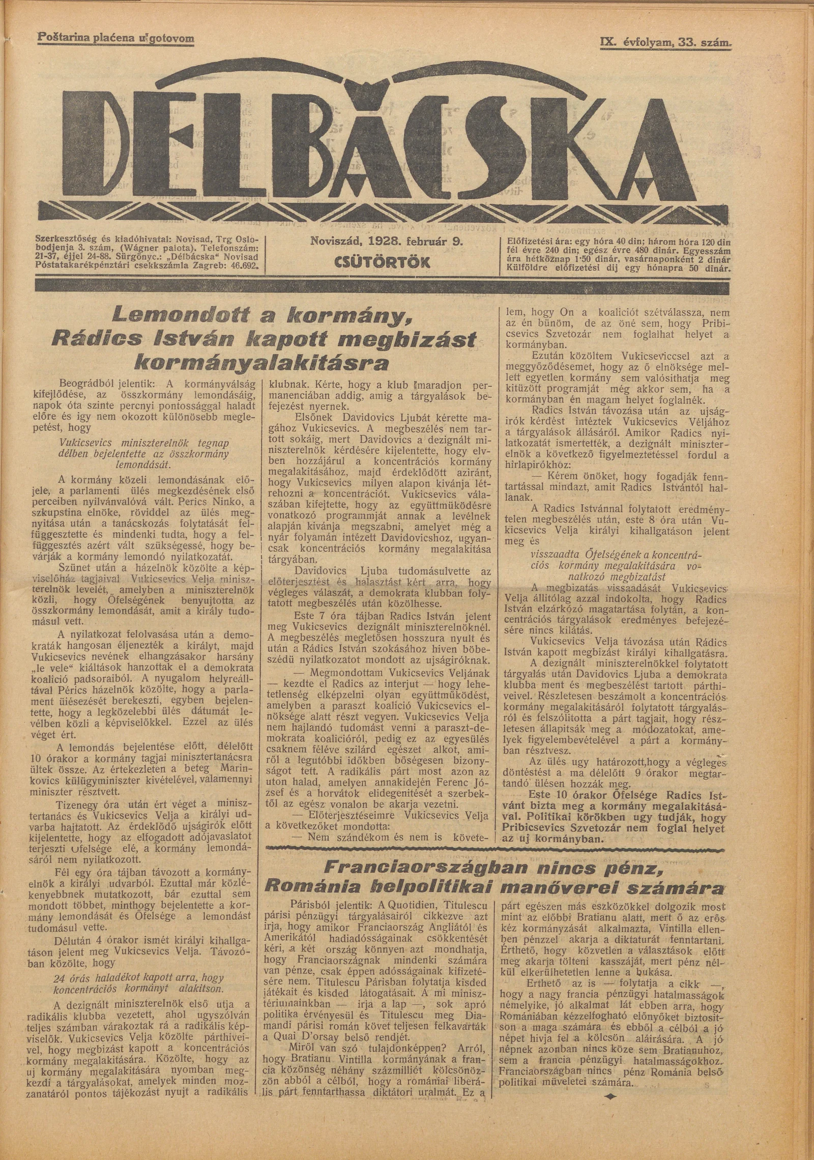 Délbácska, 9. évf. 1928. február 9. 33. sz.