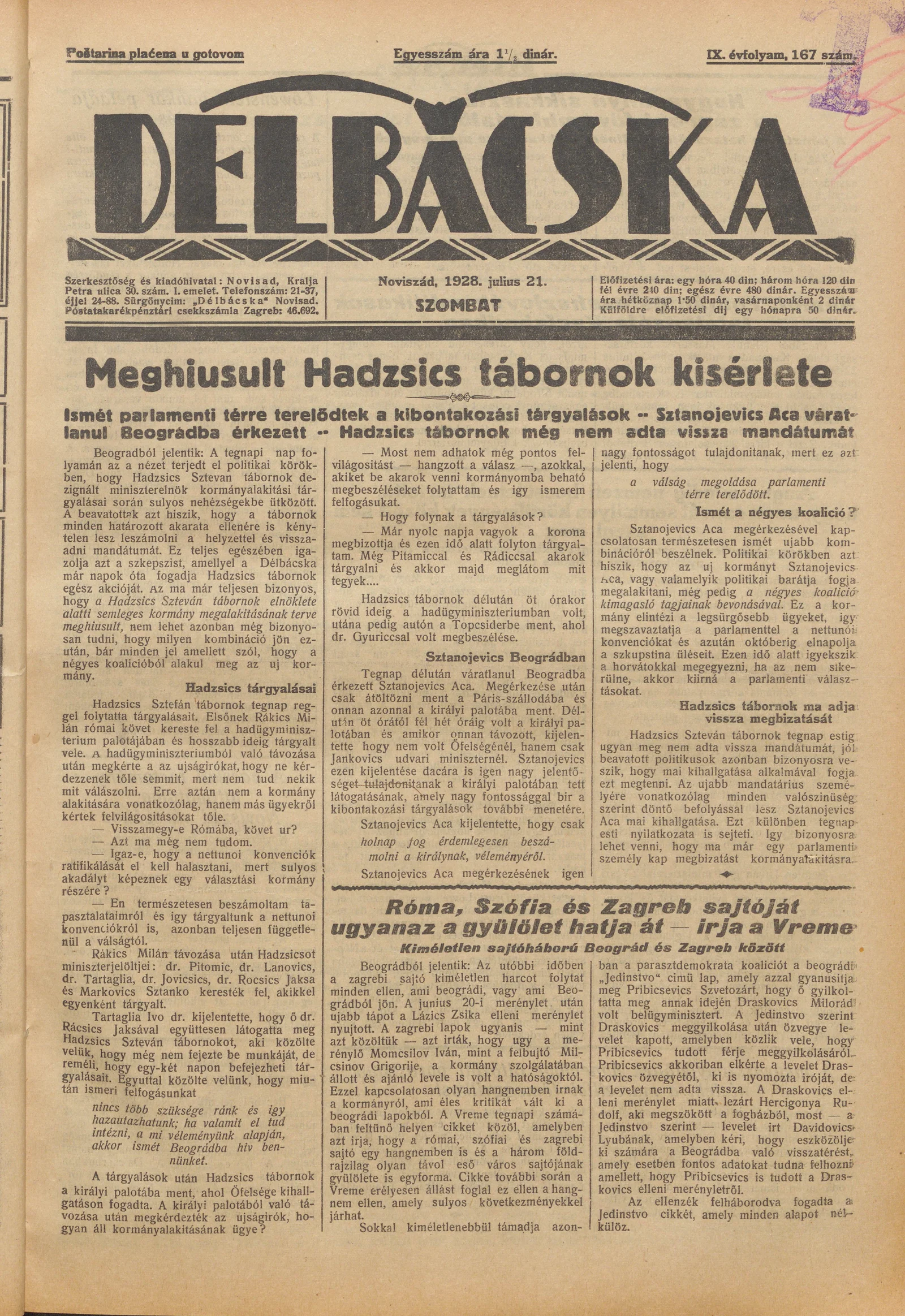 Délbácska, 9. évf. 1928. július 21. 167. sz.