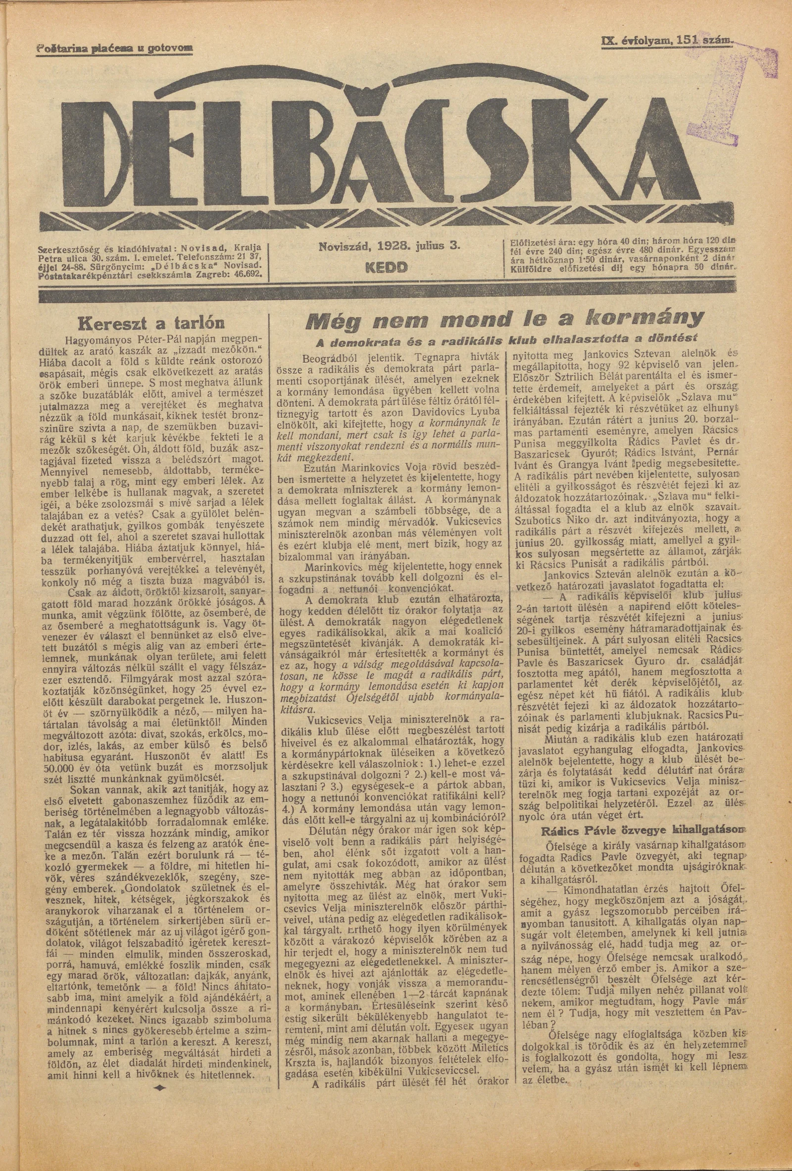 Délbácska, 9. évf. 1928. július 3. 151. sz.