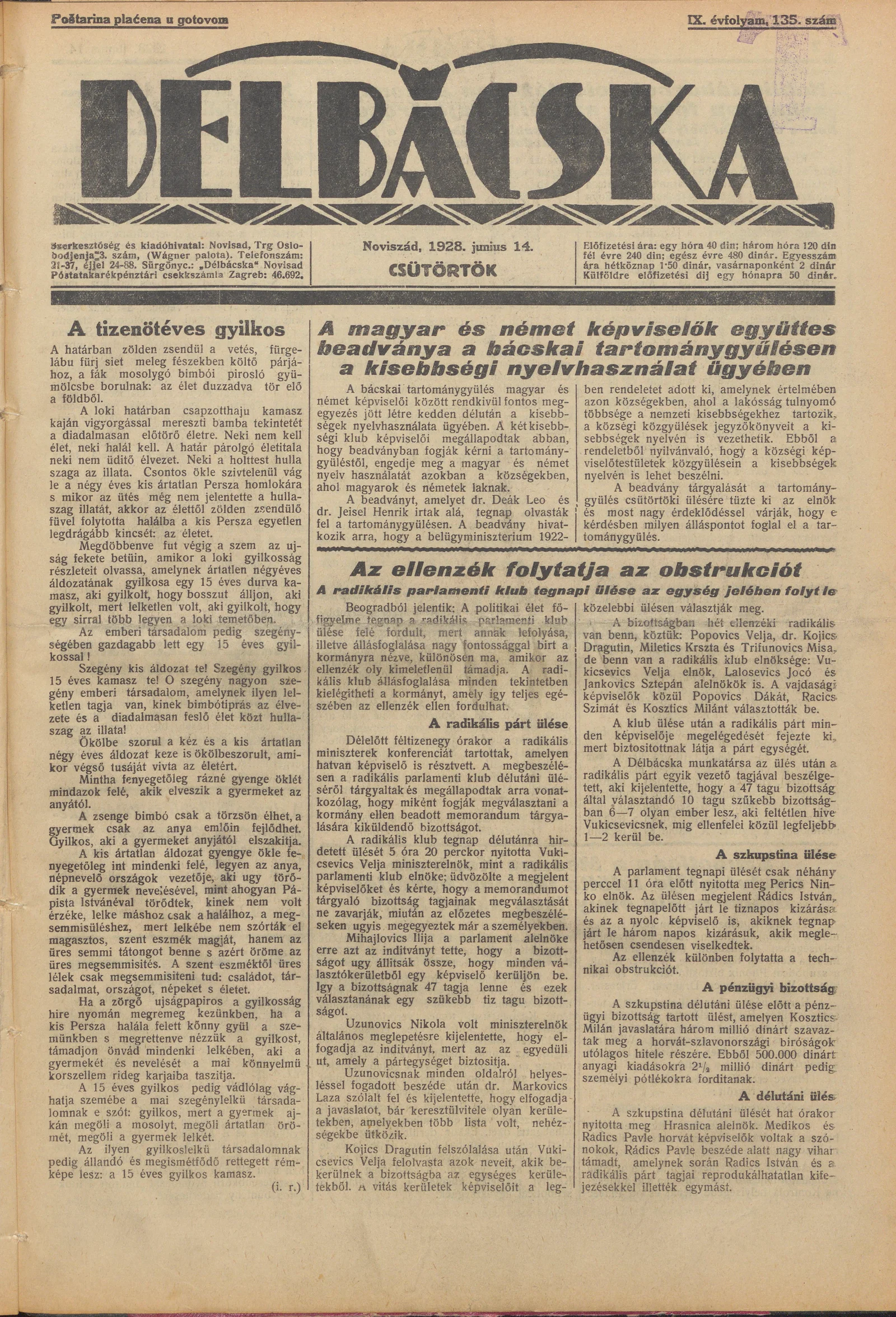 Délbácska, 9. évf. 1928. június 14. 135. sz.