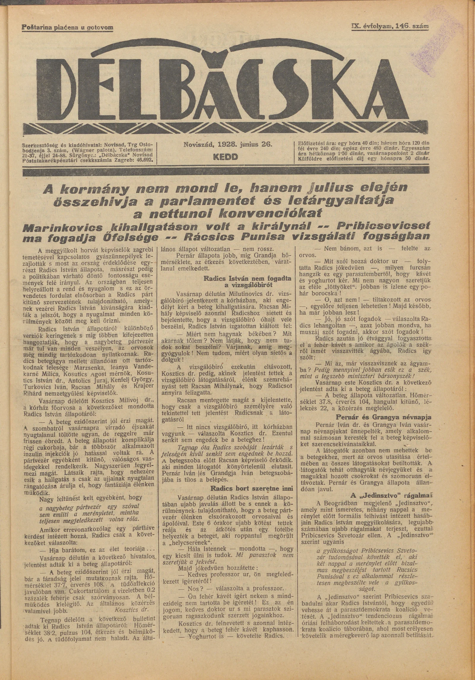 Délbácska, 9. évf. 1928. június 26. 146. sz.