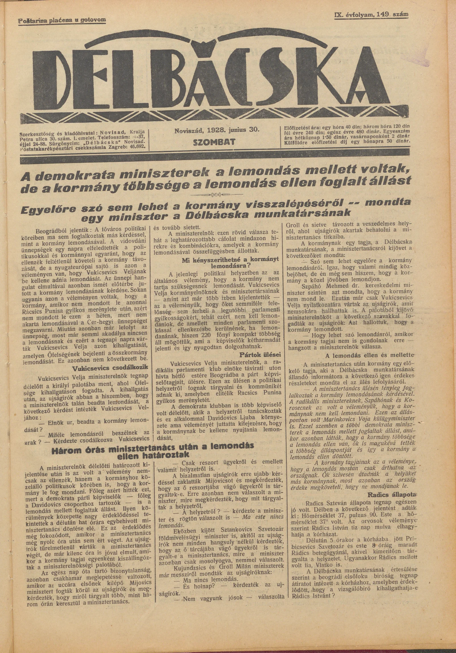Délbácska, 9. évf. 1928. június 30. 149. sz.