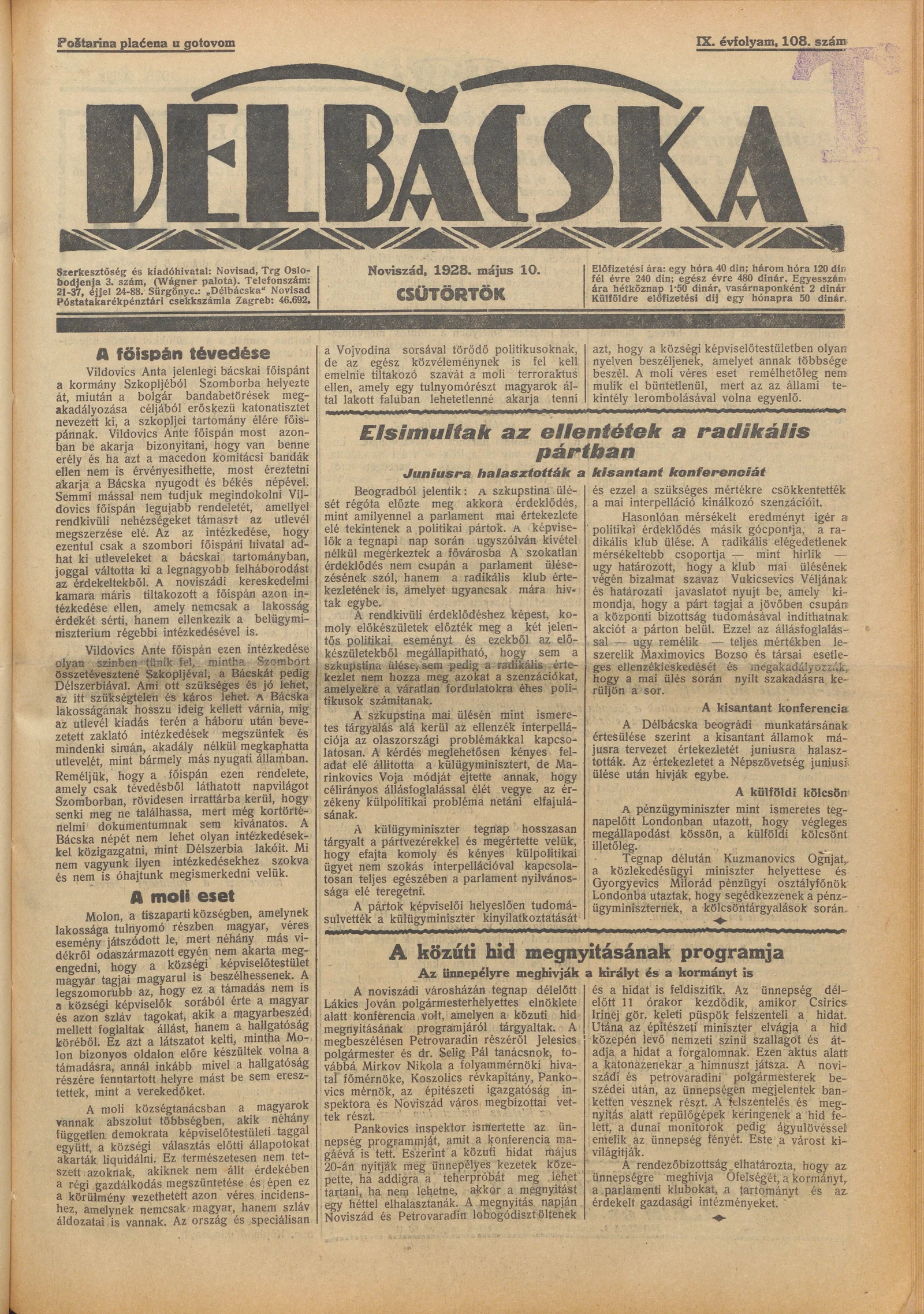 Délbácska, 9. évf. 1928. május 10. 108. sz.