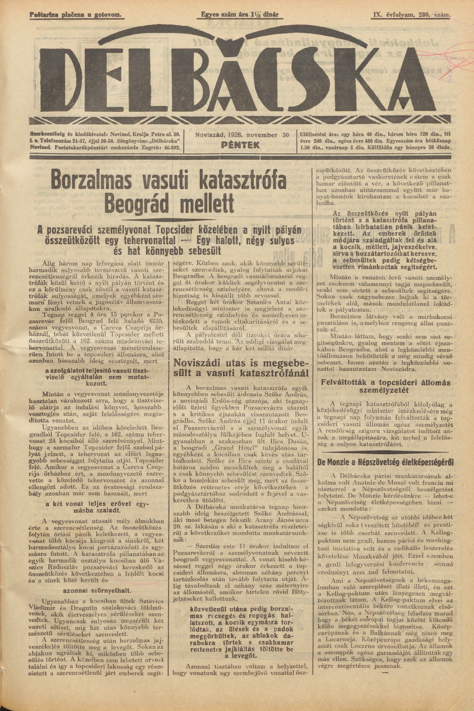 Délbácska, 9. évf. 1928. november 30. 280. sz.