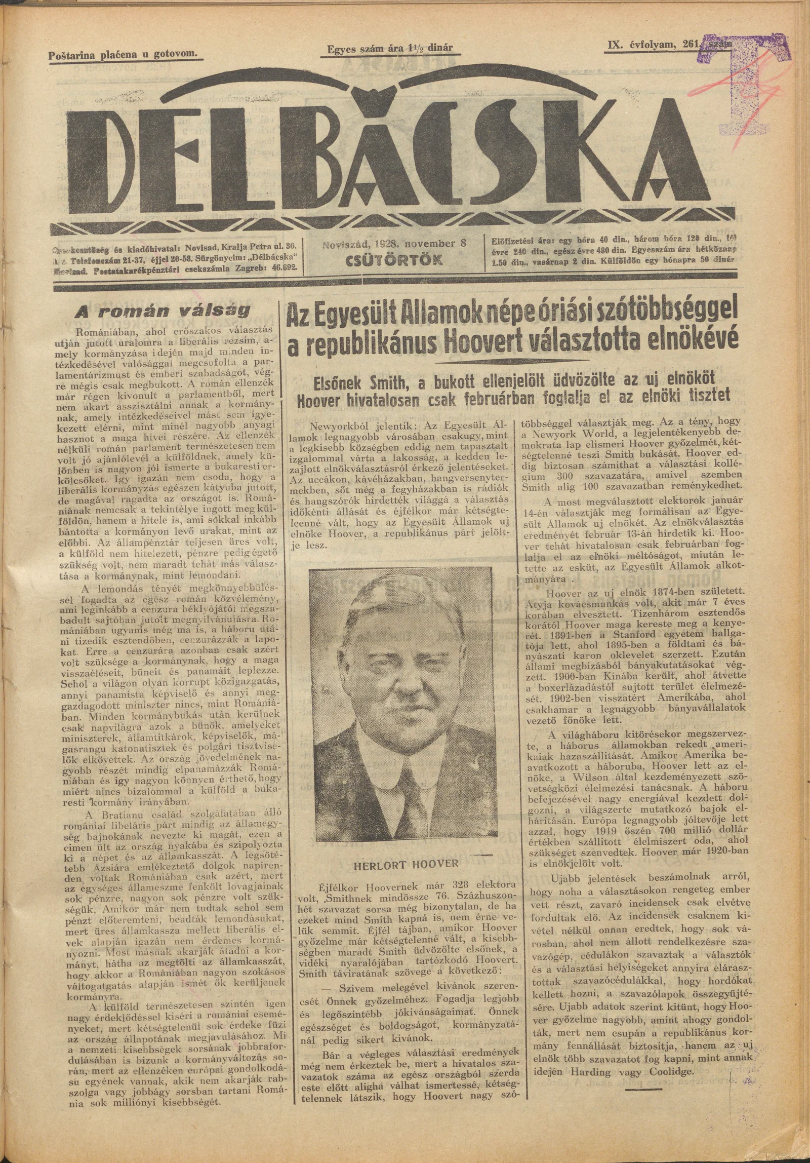 Délbácska, 9. évf. 1928. november 8. 261. sz.