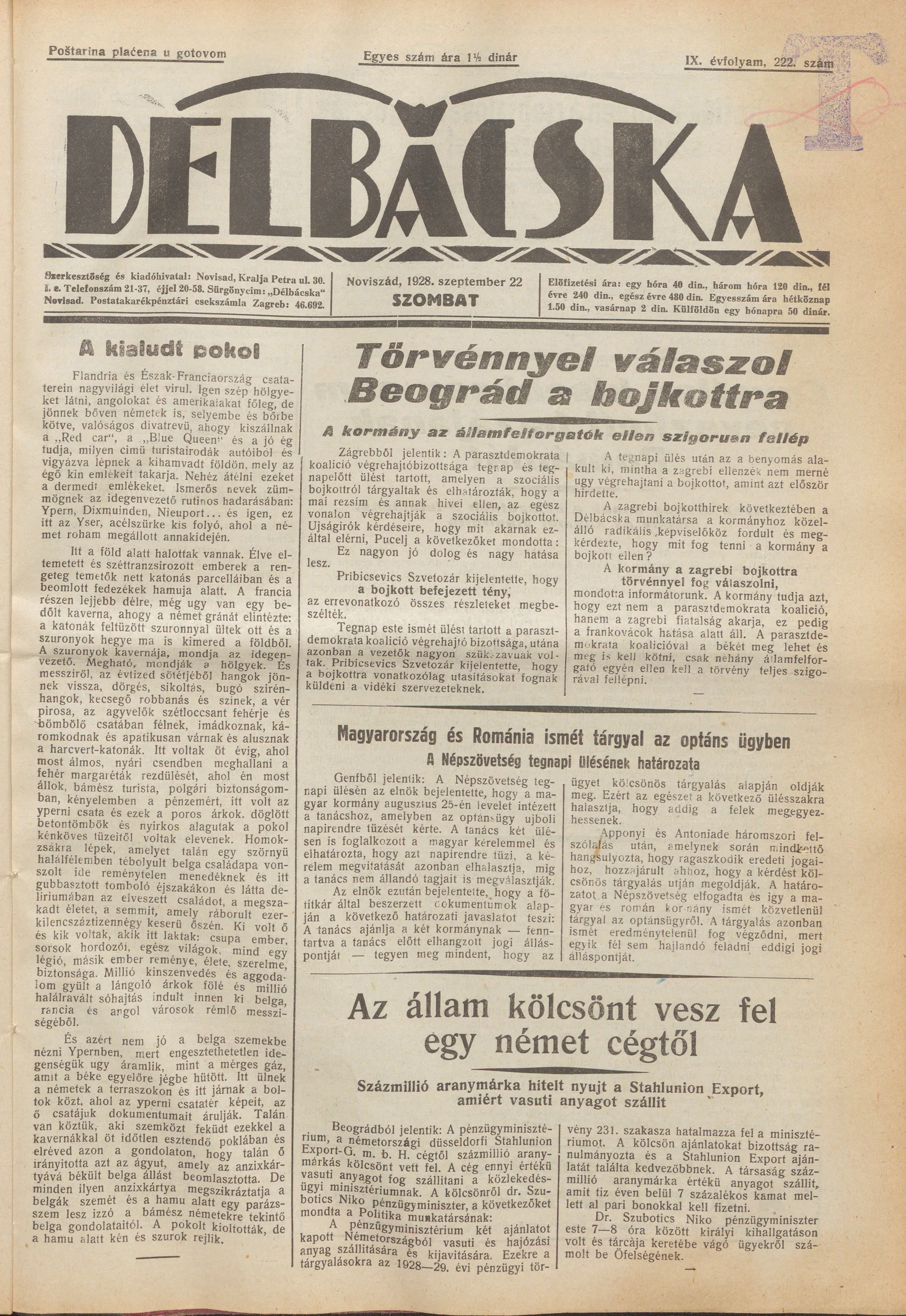 Délbácska, 9. évf. 1928. szeptember 22. 222. sz.