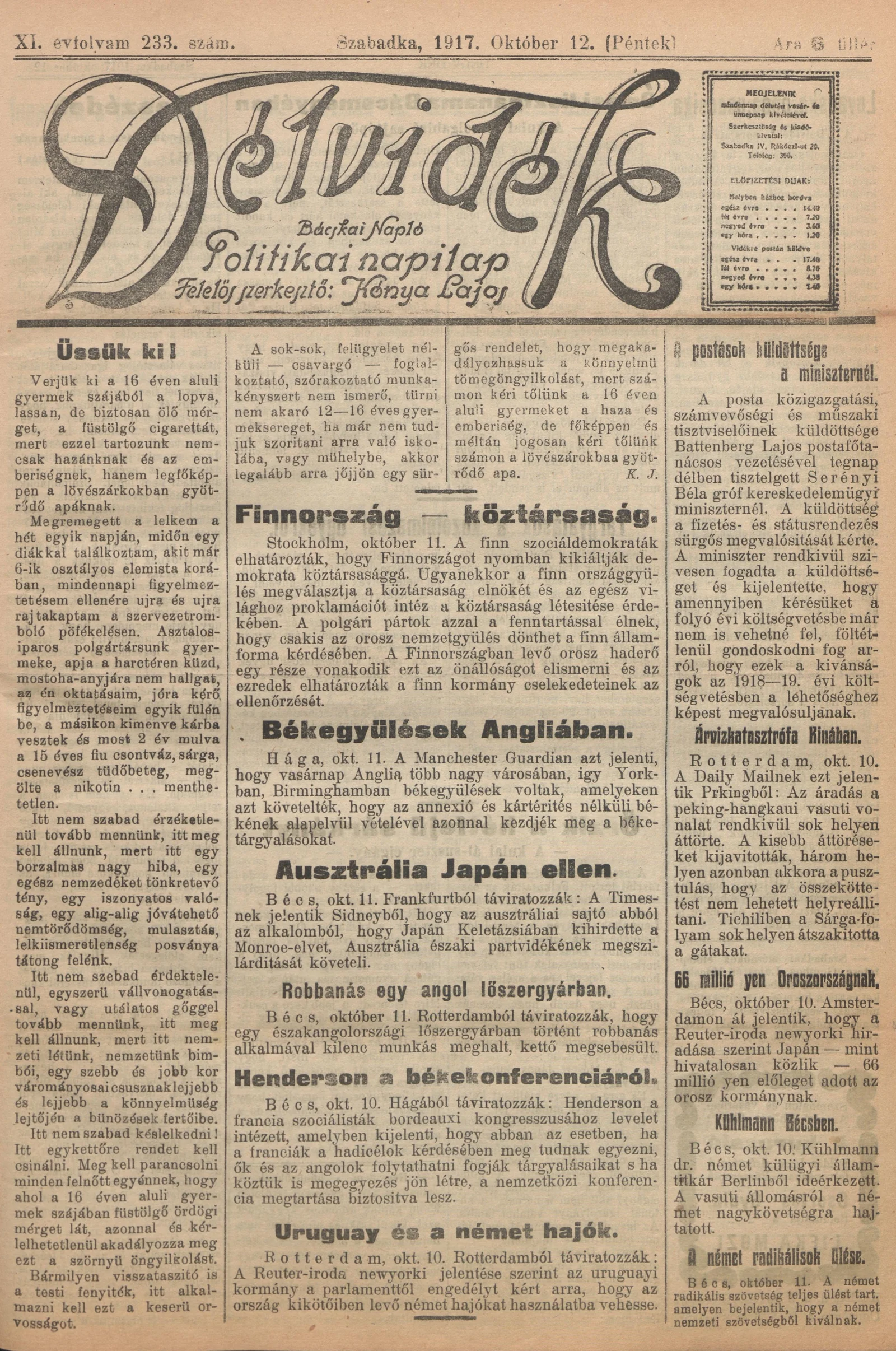 Délvidék, 11. évf. 1917. október 12. 233. sz.