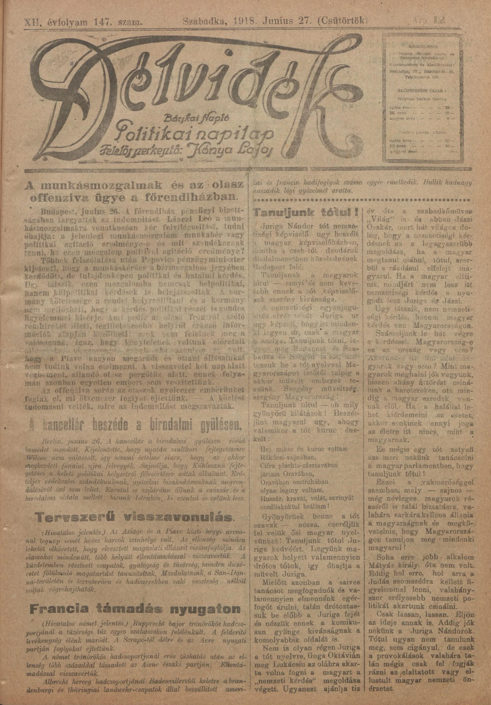 Délvidék, 12. évf. 1918. június 27. 147. sz.