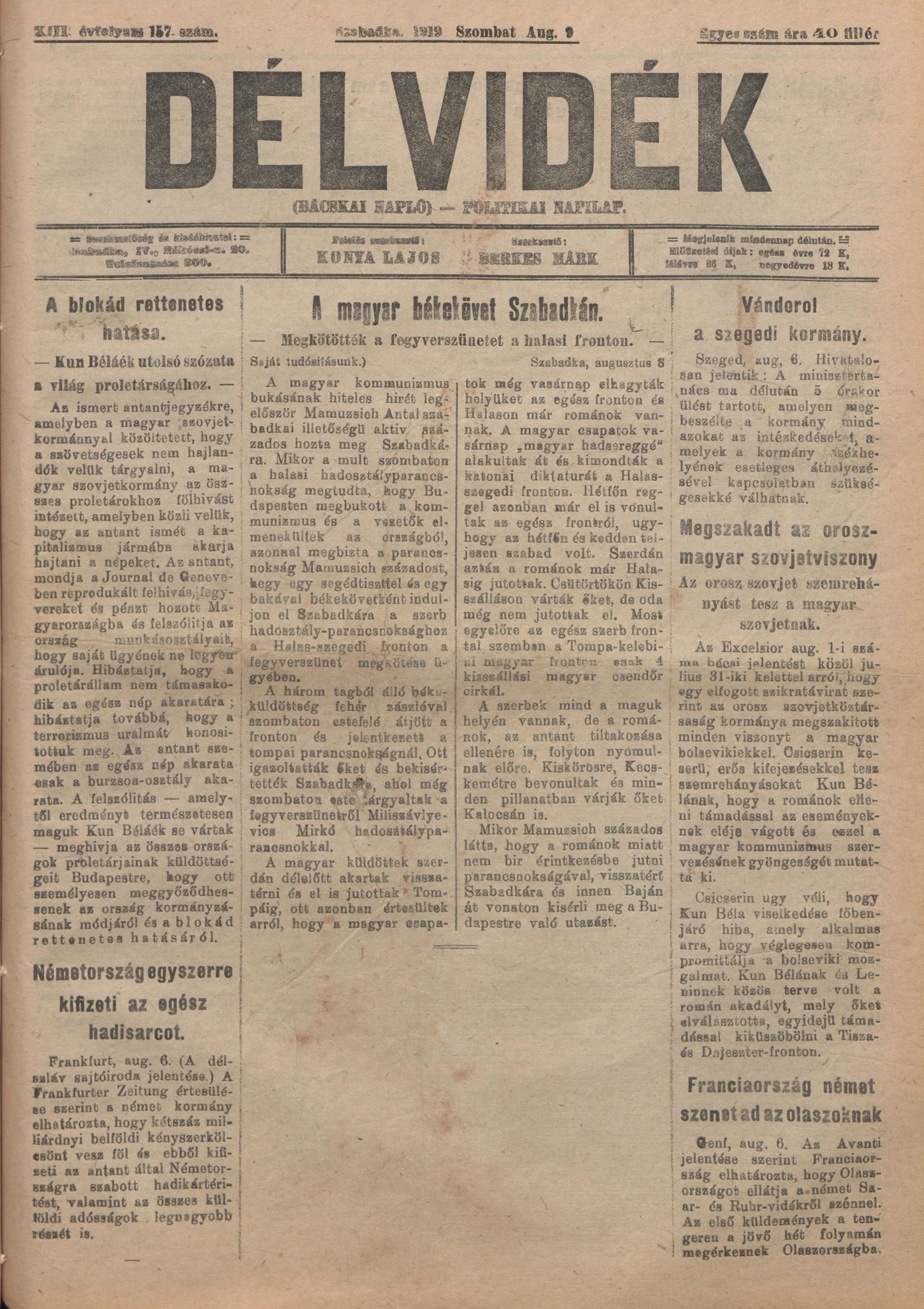 Délvidék, 13. évf. 1919. augusztus 9. 157. sz.