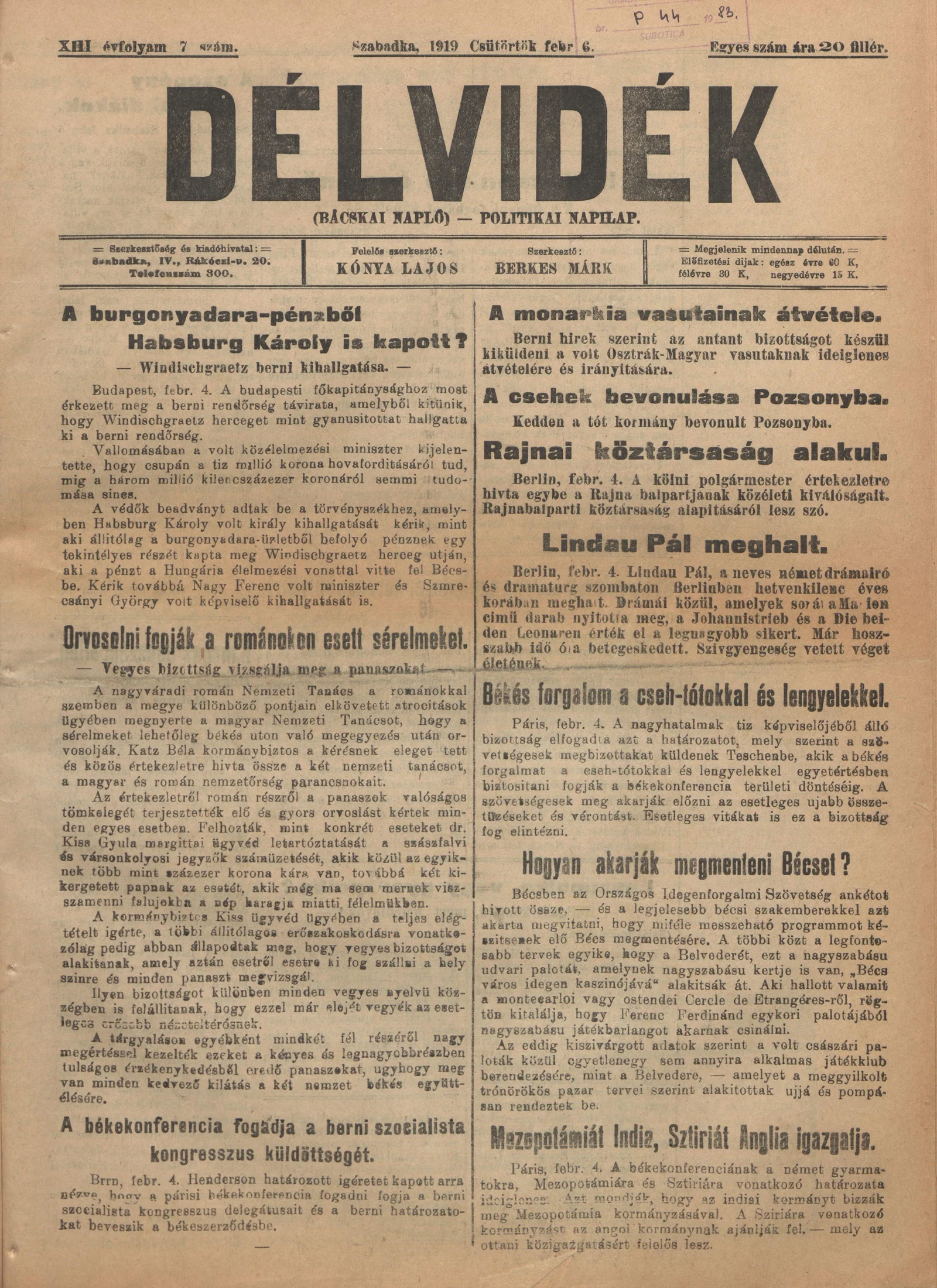 Délvidék, 13. évf. 1919. február 6. 7. sz.