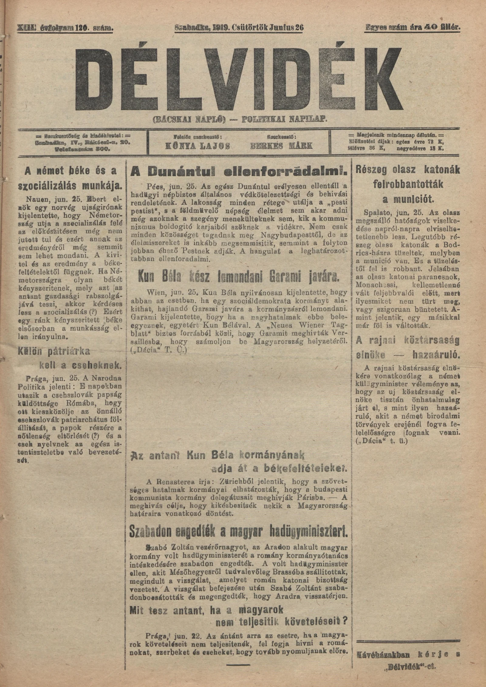 Délvidék, 13. évf. 1919. június 26. 120. sz.