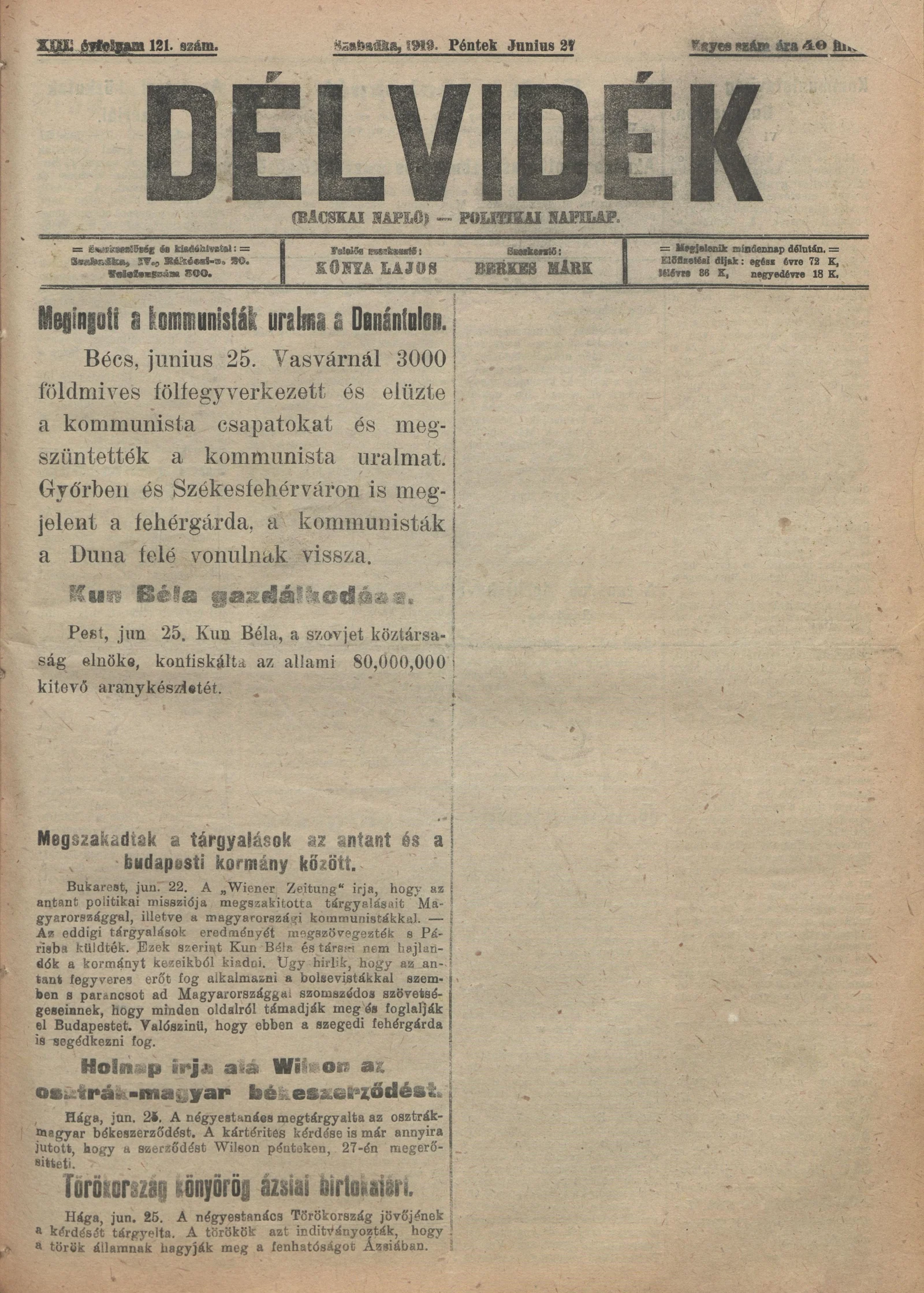 Délvidék, 13. évf. 1919. június 27. 121. sz.